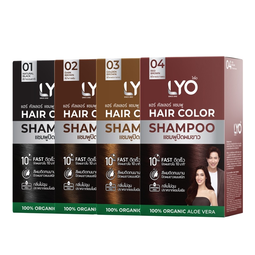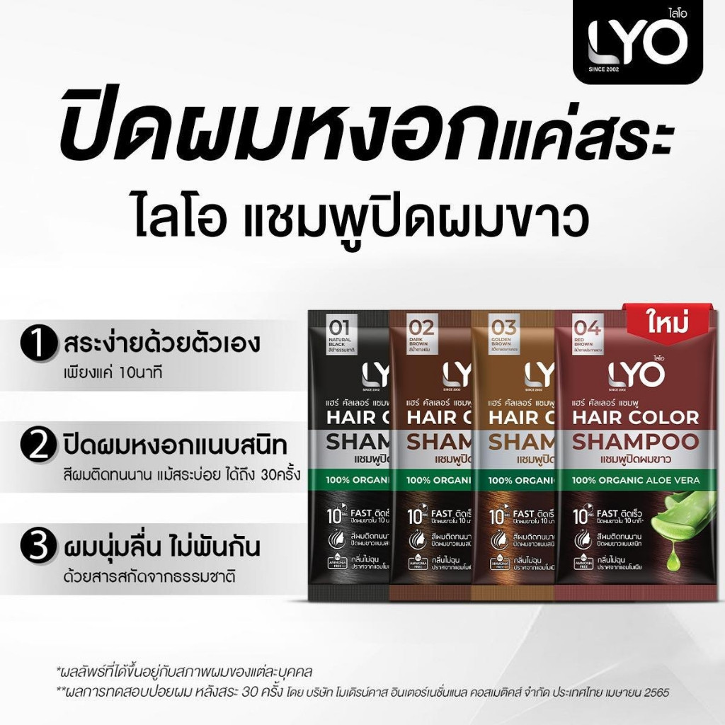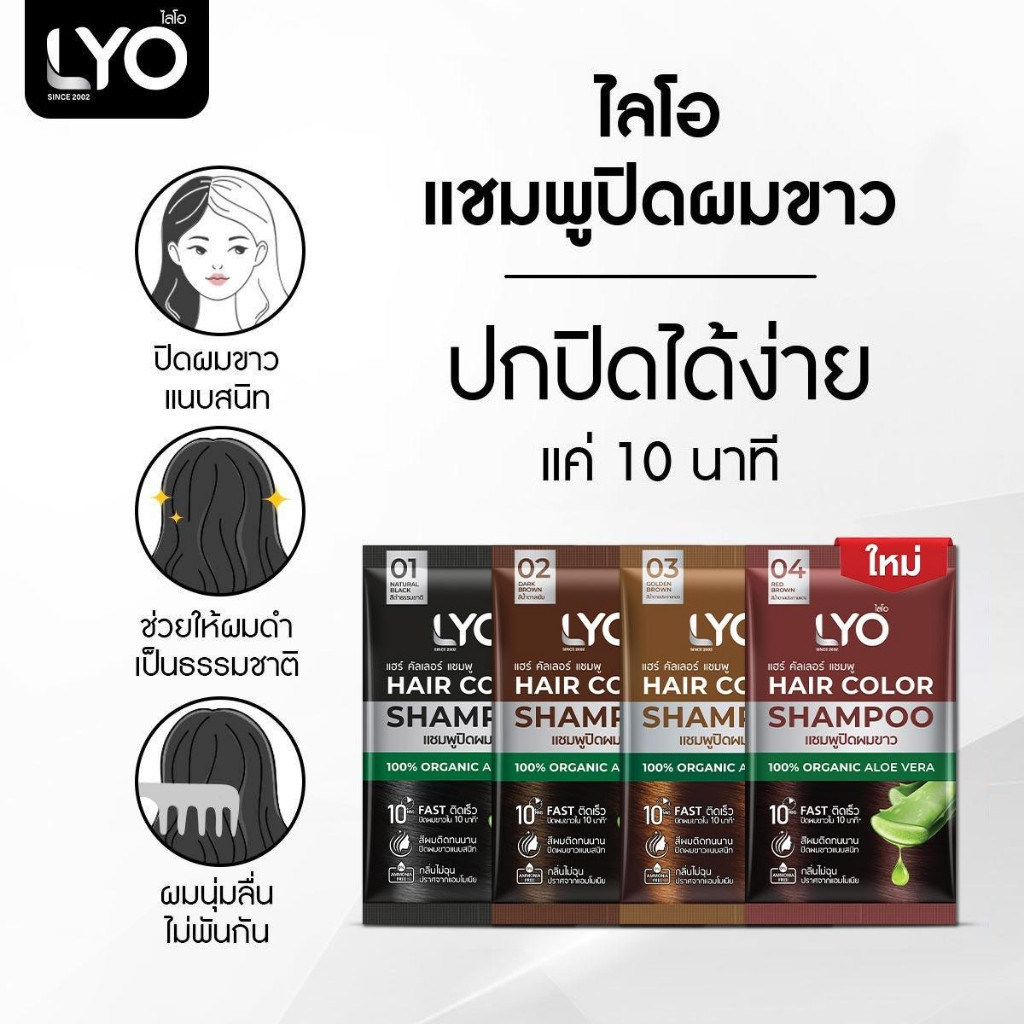 LYO HAIR COLOR SHAMPOO แชมพู ปิดผมขาว แนบสนิท ติดเร็ว กลิ่นไม่ฉุน แบบยกกล่อง 6 ซอง มี 4 เฉดสี - สีดำธรรมชาติ - สีน้ำตาลเข้ม - สีน้ำตาลประกายทอง - สีน้ำตาลประกายแดง ขนาด 30 มล. ต่อซอง แชมพูปิดผมขาว แนบสนิทเป็นธรรมชาติภายใน 10 นาที ผสานคุณค่าจากว่านหางจระเข้ อัญชัน และน้ำมันมะพร้