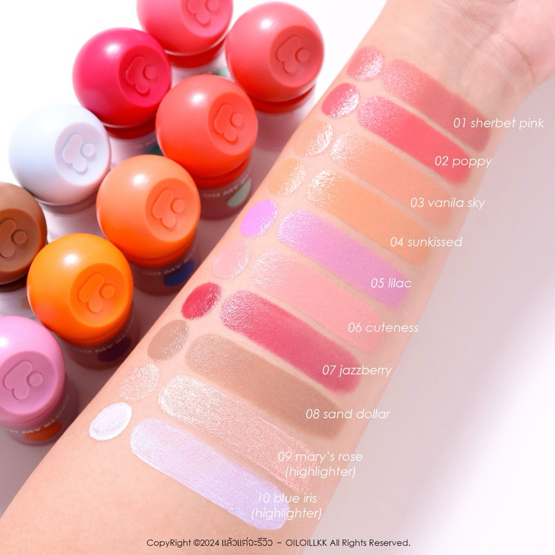 ... น สัมผัสเบาสบาย เกลี่ยได้ง่ายๆ ด้วยพัฟมาชเมลโล่ ที่แถมมาให้ในกล่อง แถมยังมีส่วนผสมช่วยให้หน้าแก้มใส ดูไบร์ทยิ่งขึ้น มี Diamond powder ทำให้หน้าแก้มมีแสง เปล่งปลั่งสุดๆ สีเบอร์ 01-08 เป็นเนื้อแมทท์ สีเบอร์ 09-10 เป็นเนื้อชิมเมอร์ มีสีสุดน่ารักให้เลือกถึง 10 เฉดสี