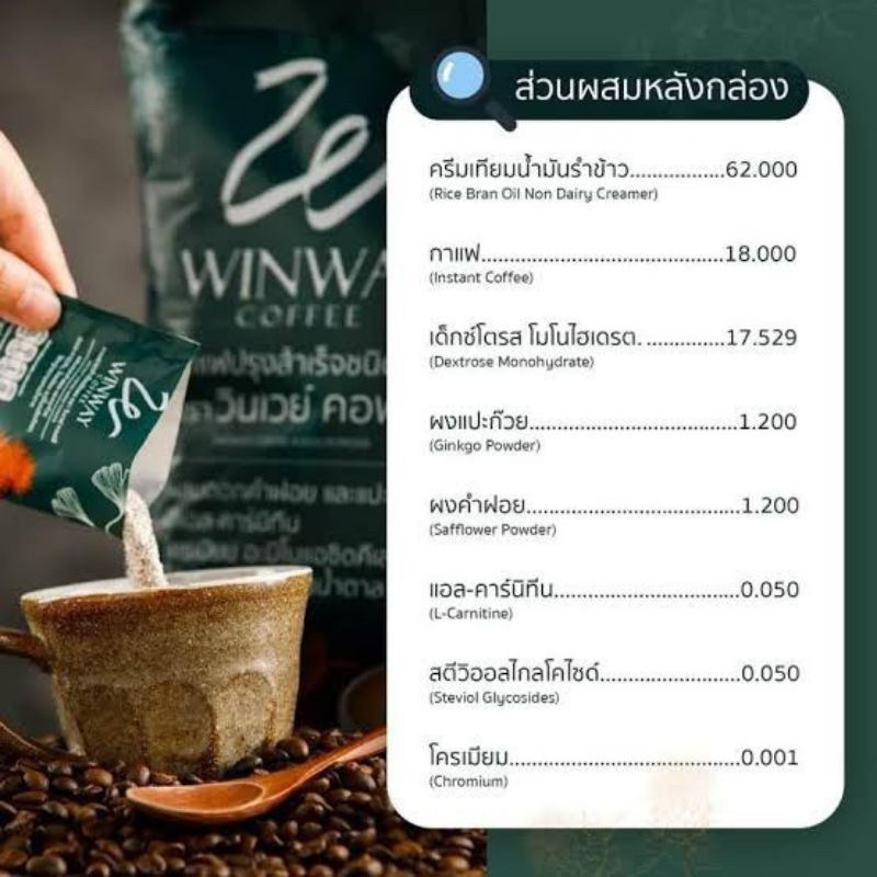 กาแฟ ตราวินเวย์ มี 50 ซอง ๆ 15กรัม -ผสมดอกคำฝอย -ผสมแปะก๊วย -มีแอลคาร์นิทีน -มีโครเมียม อะมิโนแอซิดคีเลต -ใช้หญ้าหวานแทนน้ำตาล