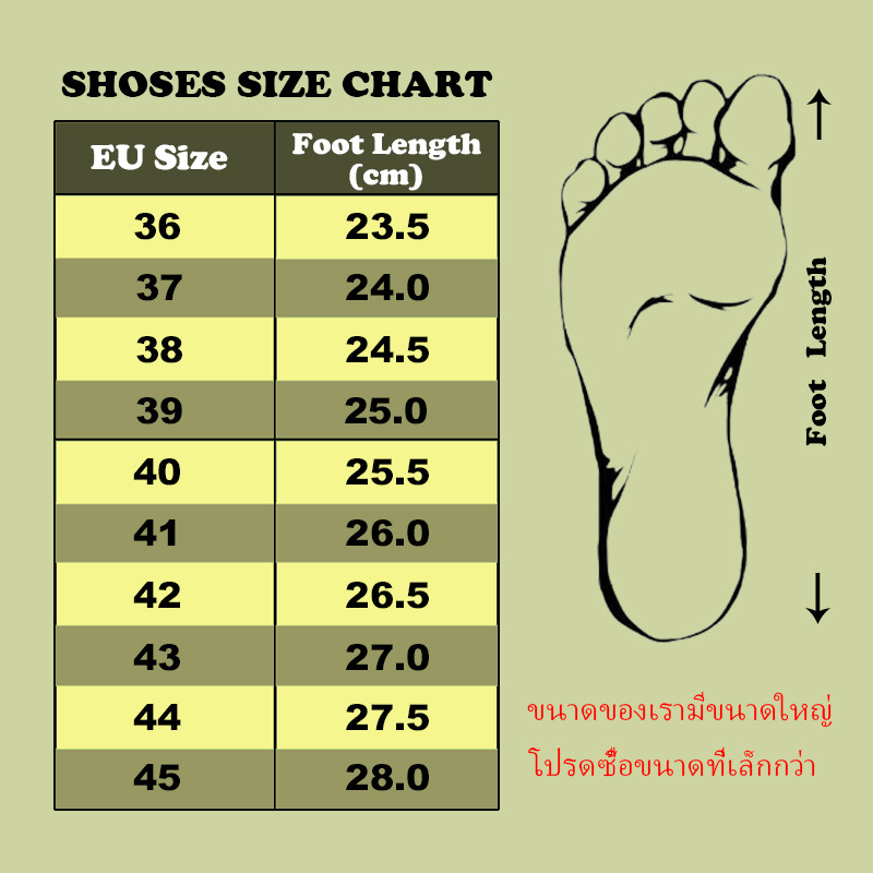 ตารางไซส์ 👣 ตารางไซส์ 👣 เพื่อช่วยคุณค้นหาไซส์รองเท้าที่เหมาะสมที่สุด โปรดดูตารางไซส์ด้านล่าง: TF093_1 👣 ไซส์ 40 = ความยาวเท้า 26.0 cm 👣 ไซส์ 41 = ความยาวเท้า 26.7 cm 👣 ไซส์ 42 = ความยาวเท้า 27.3 cm 👣 ไซส์ 43 = ความยาวเท้า 28.0 cm 👣 ไซส์ 44 = ความยาวเท้า 28.6 cm 👣 ไซส์ 45 = ความยาวเท้า