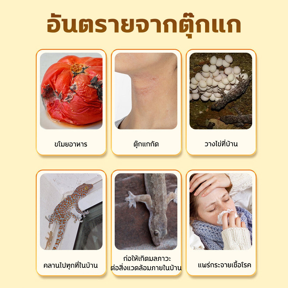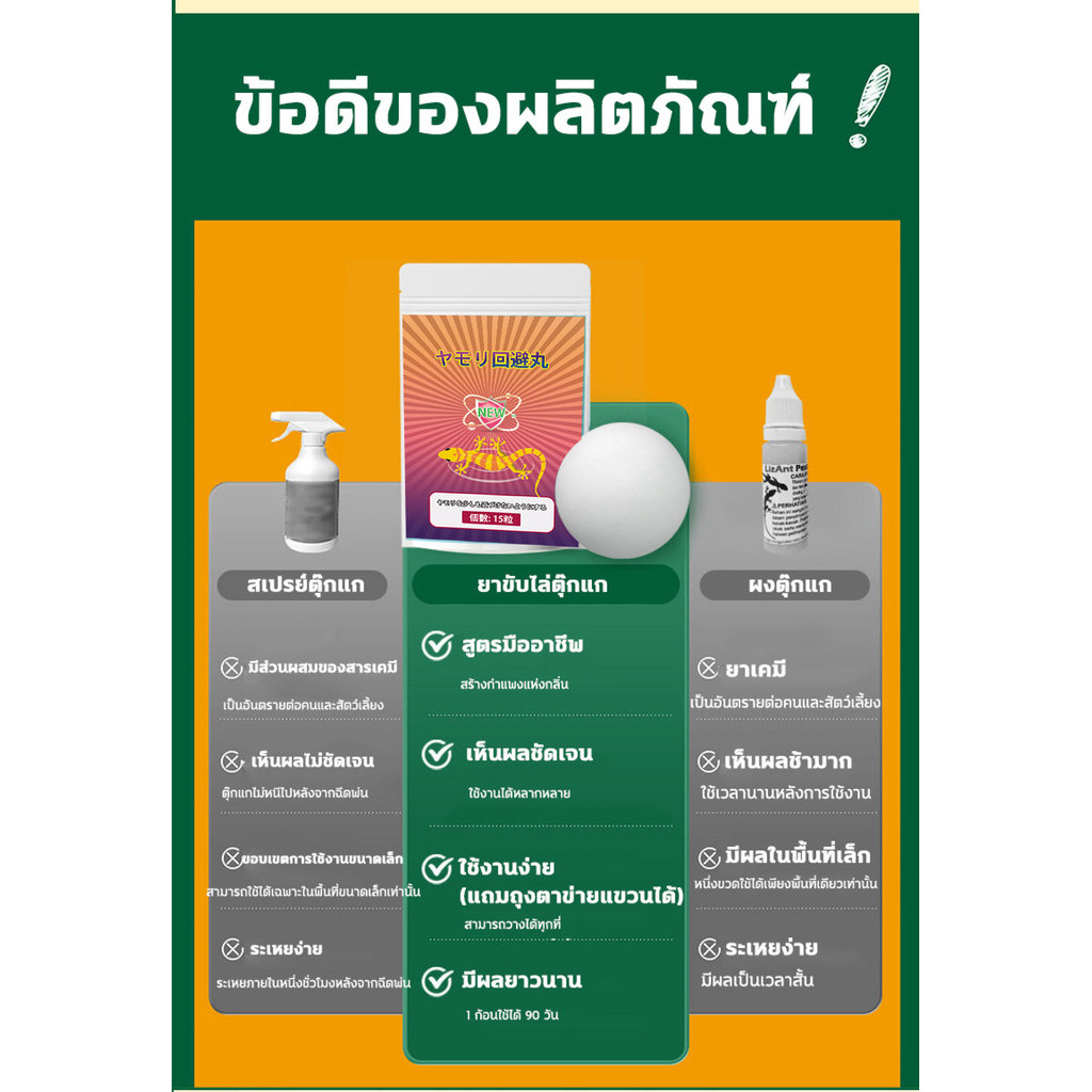 ข้อมูลผลิตภัณฑ์ ชื่อผลิตภัณฑ์: ยาไล่ตุ๊กแก ส่วนประกอบหลัก: การบูร พริกไทย มิ้นต์ ขิง สารออกฤทธิ์ไล่ตุ๊กแก ฯลฯ ปริมาณ: 15 ก้อน/ถุง อายุการเก็บรักษา:3 ปี คุณสมบัติ:ส่วนผสมจากพืชหลายชนิด ไม่มีอันตรายต่อคน สามารถขับไล่ตุ๊กแกได้อย่างมีประสิทธิภาพ งตุ๊กแกโดยการปล่อยกลิ่น ทำให้ตุ๊กแกรู้สึกอึดอัดและหลบ