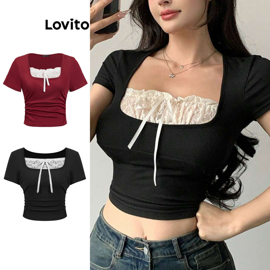 Lovito เสื้อยืดผู้หญิง ลูกไม้ แต่งโบว์ ผ้าเย็บต่อ สีพื้น สไตล์น่ารัก L90AD007(หลากสี)