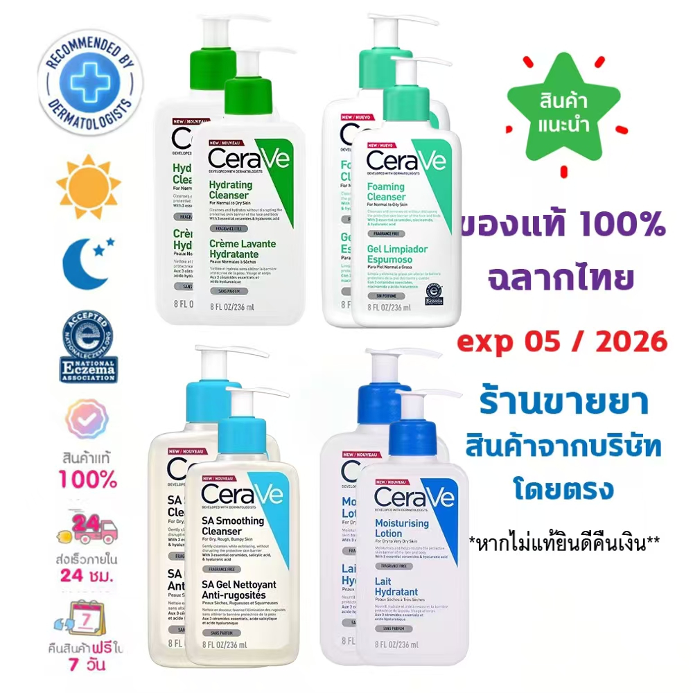 • Cerave Foaming Cleanser 236ml โฟมล้างหน้าและผิวกายสำหรับผิวธรรมดา ผิวมัน ง่ายต่อการทำความสะอาดผิว ด้วยส่วนผสมของเซราไมด์และไนอาซินาไมด์ช่วยปลอบประโลมผิวจากการระคายเคือง และอย่าให้ผิวแห้งหลังทำความสะอาดผิว • Cerave Hydrating Cleanser 236ml ผลิตภัณฑ์ทำความสะอาดผิวหน้าและผิวกายสูตรสำหรับผิวธรรมดาถึง