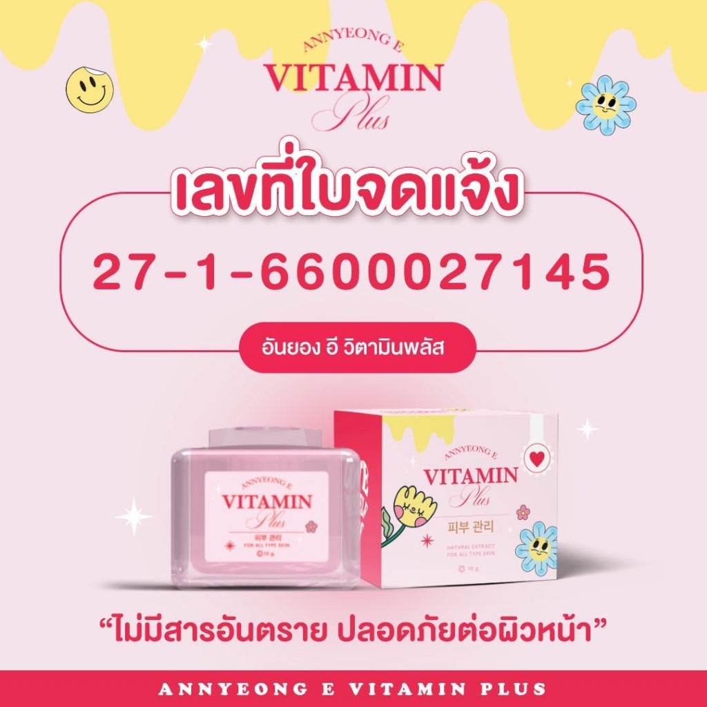 Annyeong E Vitamin Plus อันยอง อี วิตามิน พลัส ครีมบำรุงผิวหน้าให้กระจ่างใส สรรพคุณ - ผิวหน้ากระจ่างใส ชุ่มชื้น อิ่มฟู - ช่วยฟื้นฟูผิว ปลอบประโลมผิว - ลดสิว ลดการอักเสบของผิว - ลดริ้วรอย ลดเลือนจุดด่างดำ - ผิวเรียบเนียน รูขุมขนกระชับ - ลดรอยดำ รอยแดง วิธีใช้ : ใช้ทาก่อนนอน ขนาด 10