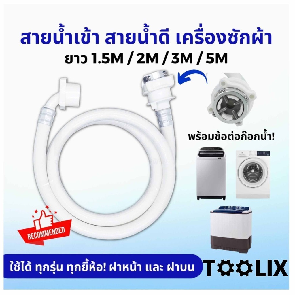สายน้ำเข้า สายน้ำดี หัวต่อก๊อก เครื่องซักผ้า ยาว 1.5M/2M/3M/5M พร้อม ข้อต่อก๊อกน้ำ ใช้ได้ทุกรุ่น ทุกยี้ห้อ ฝาหน้า ฝาบน