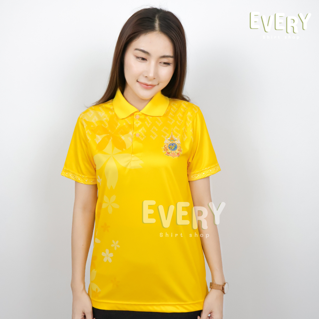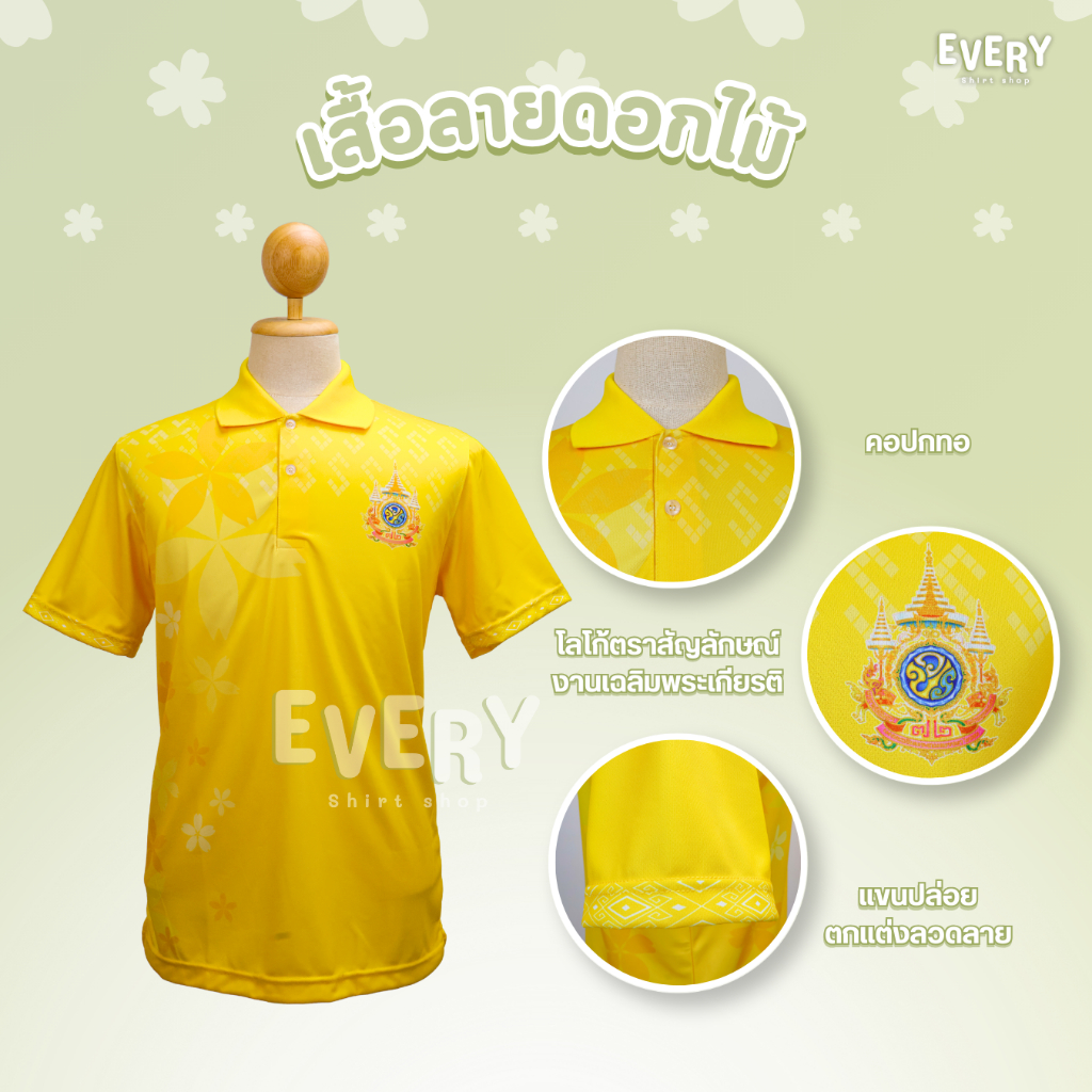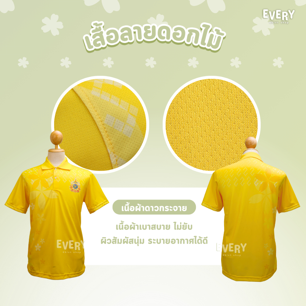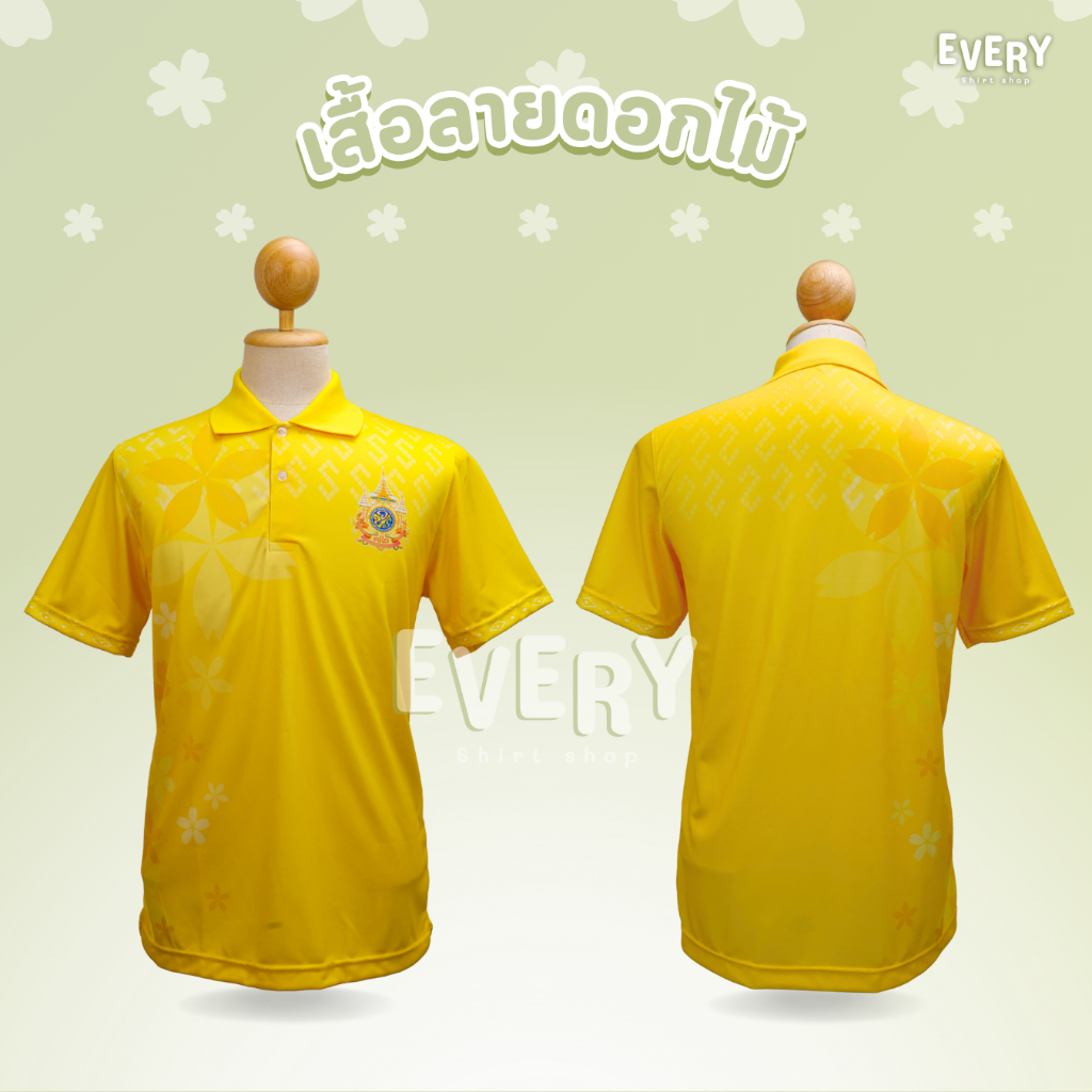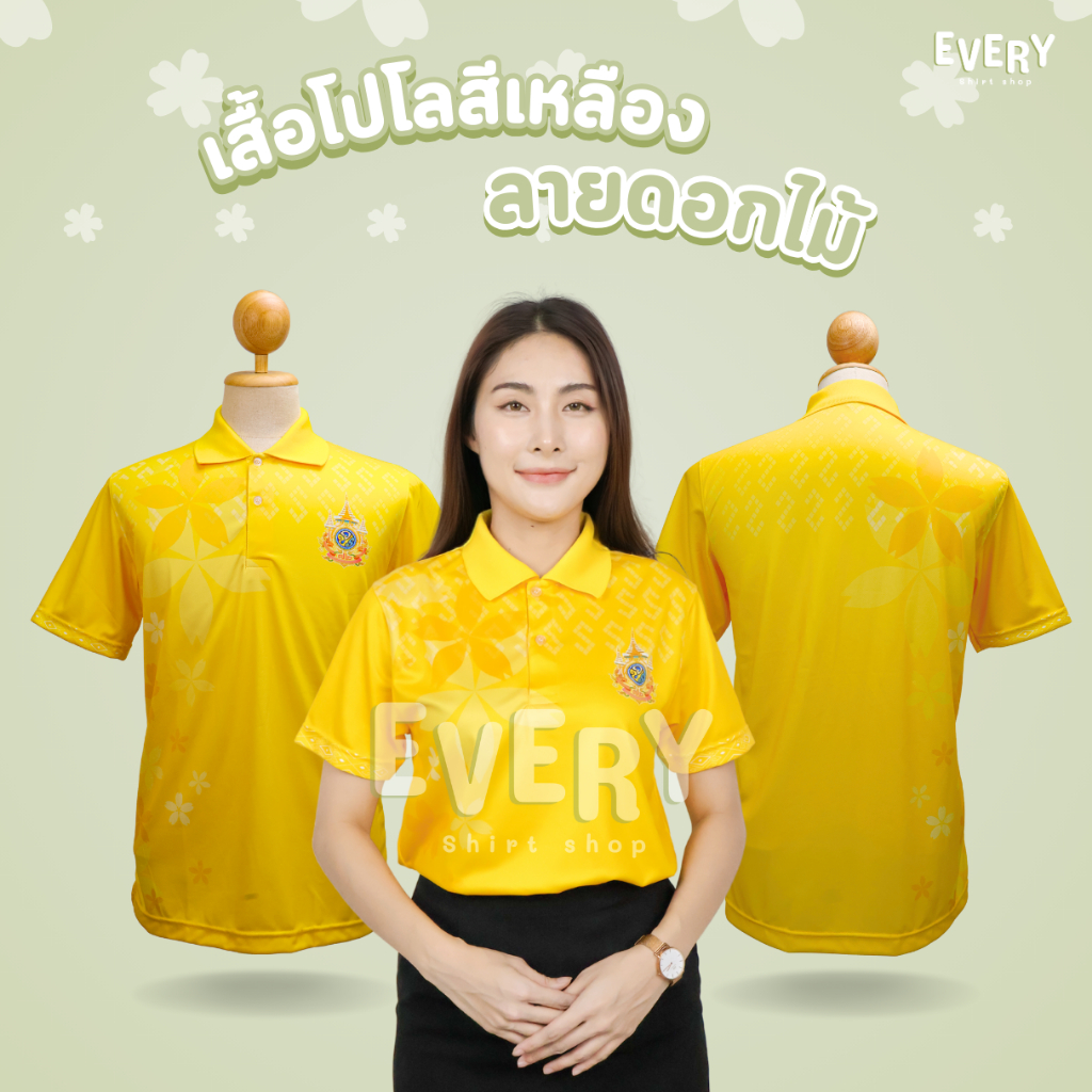 Every Shirt Shop เสื้อโปโลสีเหลืองพิมพ์ลาย ลายดอกไม้ เสื้อเหลืองตราสัญลักษณ์ เนื้อนุ่ม ไม่ต้องรีด