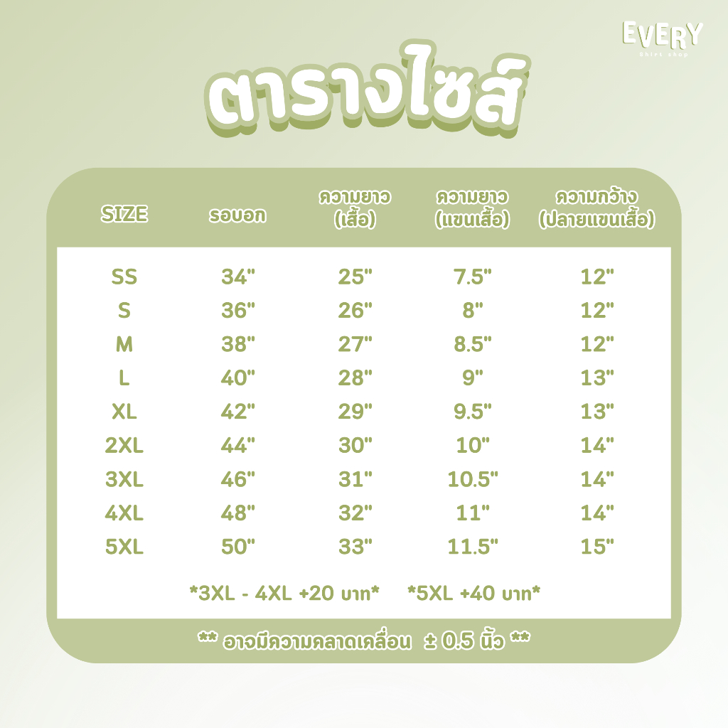 ... ำนวนมากกว่า 50 ตัว โปรดทักแชทเพื่อรับราคาสุดพิเศษ ------------------------------------------------------- รายละเอียดสินค้า - ผ้าดาวกระจาย เกรดพรีเมี่ยม - นุ่มสบาย ระบายอากาศดี - ปกทอเนื้อนุ่ม ไม่บาดผิว - สีสวยสด คมชัด - ไม่ต้องรีด ------------------------------------------------------- การเพิ่มข้อความหรือโลโก้ - สามารถเพิ่มข้อความหรือโลโก้ เมื่อสั่งขั้นต่ำ 10 ตัวขึ้นไป - ระยะเวลาผลิต 7 - 14 วัน - ทักแชทสอบถามแอดมินเพิ่มเติมก่อนสั่งนะคะ ------------------------------------------------------- เงื่อนไขการรับประกัน - หากสินค้าที่ได้ไปไม่ตรงกับที่ลูกค้าสั่ง ทักแชทเพื่อติดต่อแอดมินแก้ไขก่อนให้คะแนนนะคะ - หากสินค้ามีตำหนิ สามารถเปลี่ยนสินค้าได้ภายใน 3 วันนับตั้งแต่วันได้รับสินค้า ------------------------------------------------------- การจัดส่ง - จัดส่งสินค้าทุกวัน ยกเว้นวันอาทิตย์ - ตัดรอบจัดส่ง 13.00 น. ของทุกวัน ------------------------------------------------------- ขนาดไซส์ (นิ้ว) SS อก 34 ยาว 25 S อก 36 ยาว 26 M อก 38 ยาว 27 L อก 40 ยาว 28 XL อก 42 ยาว 29 2XL อก 44 ยาว 30 3XL อก 46 ยาว 31 4XL อก 48 ยาว 32 5XL อก 50 ยาว 33