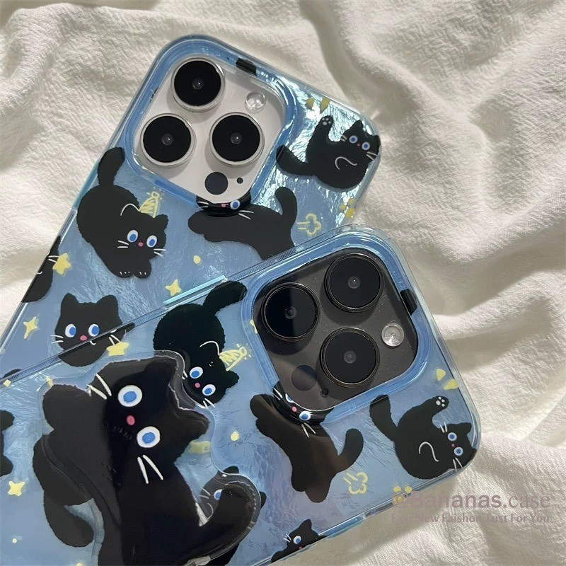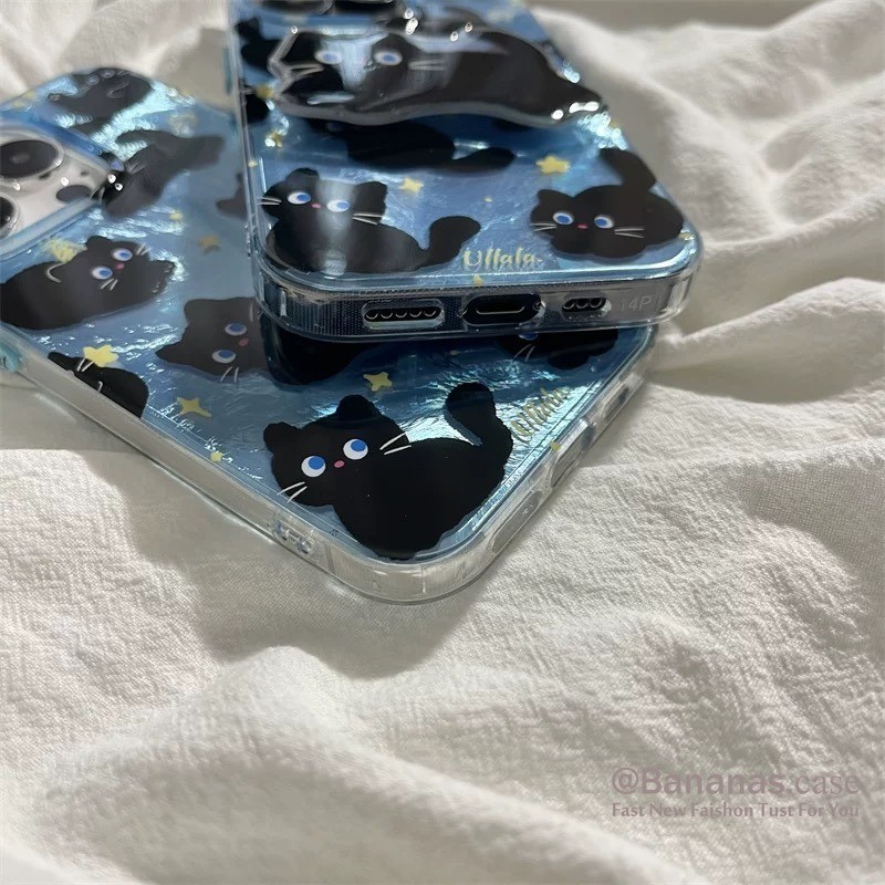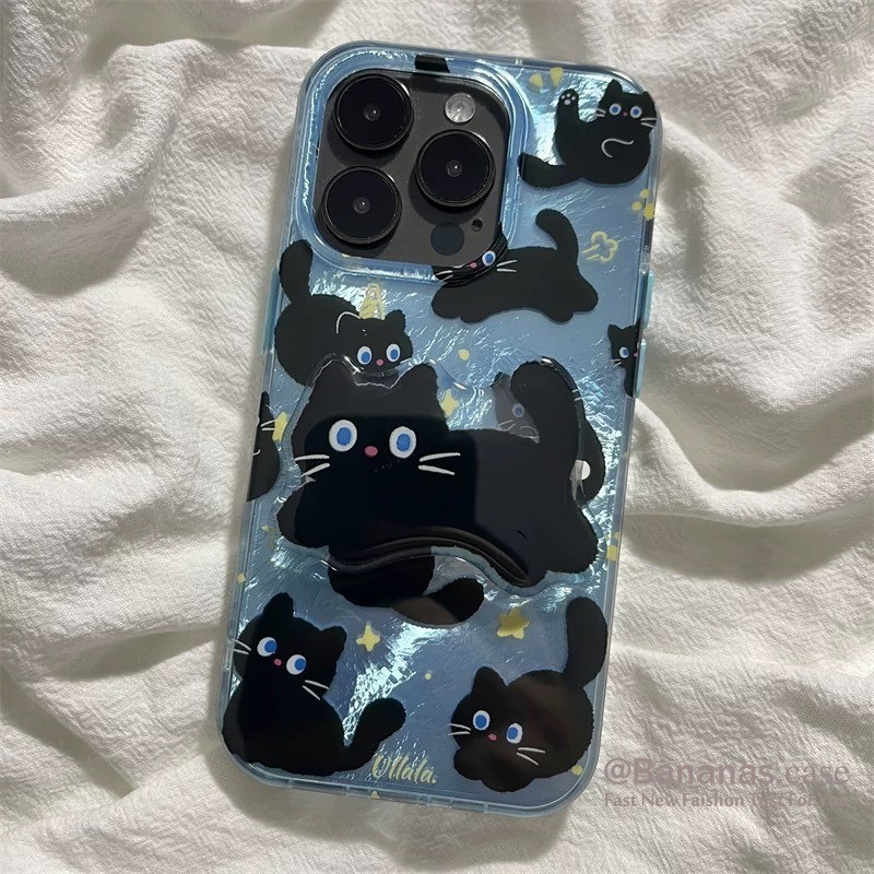 Iphone 15 14 13 12 11 Pro Max X Xr Xs Max 7 8 Plus SE2020 เคสโทรศัพท์น่ารักแมวดํา + ขาตั้งปกอ่อนใส