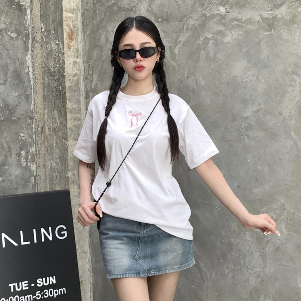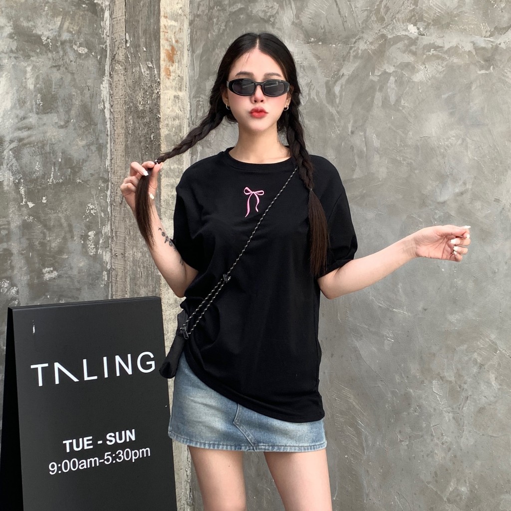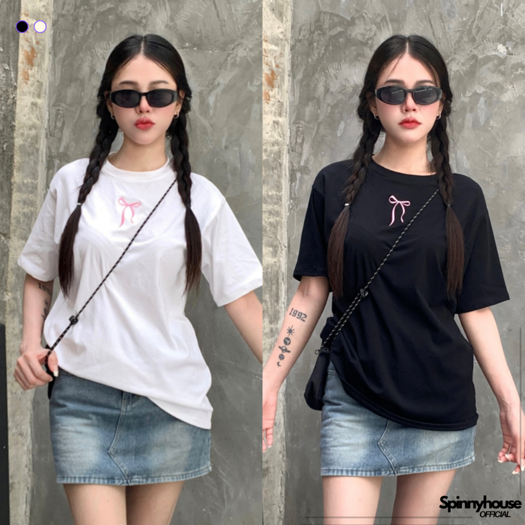 🌈SpinnyHouse🌈เสื้อยืดOversize ปักโบว์ชมพู ผ้ายืดยูนิโค่ 🌼 ทรงโอเวอร์ไซต์ ใส่ได้ทั้งชายหญิง UNISEX รุ่น Oversizeโบว์ชม