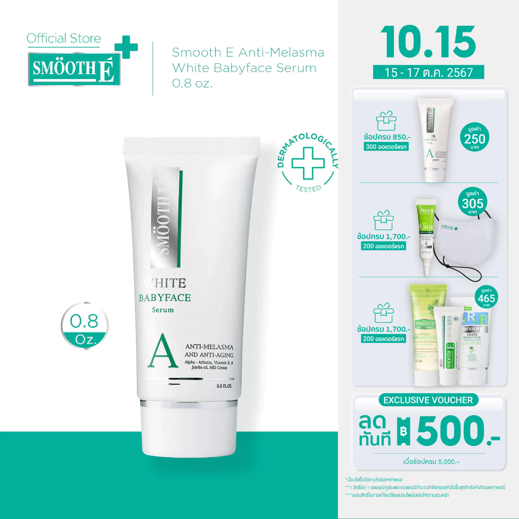 Smooth E Anti-Melasma White Babyface Serum สมูทอี ไวท์เบบี้เฟซ เซรั่ม มี 2 ขนาด. ขนาด 0.4 ออนซ์ ขนาด 0.8 ออนซ์ - สมูทอี ไวท์ เบบี้เฟซ เซรั่ม "ผลิตภัณฑ์สมูทอีที่ออกแบบมาเพื่อดูแลรักษาผู้ที่มีปัญหาเรื่อง "ฝ้า" อย่างมืออาชีพ" เซรั่มลดฝ้า ... อย่างได้ผลและปลอดภัย ด้วยประสิทธิภาพของ Alph