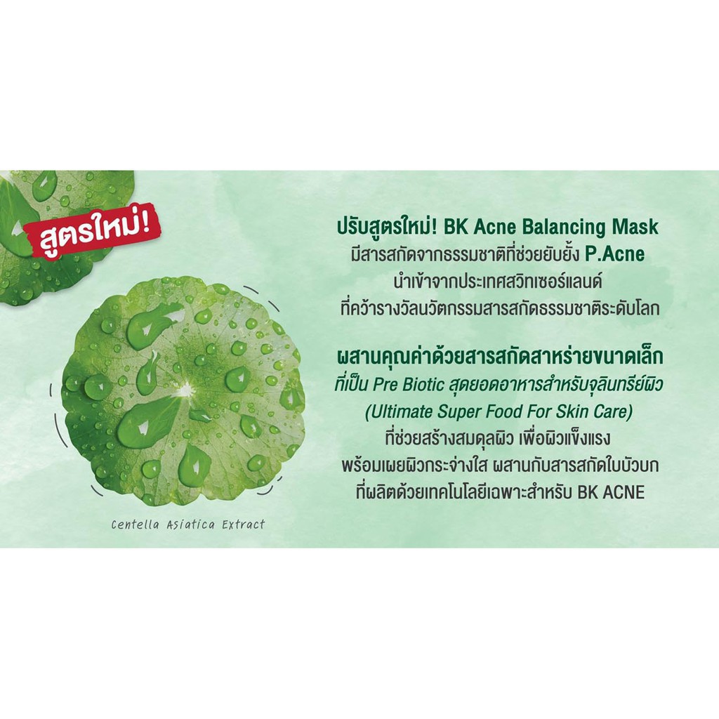BK Acne Balancing Mask มาส์กสิวปรับสมดุลผิว "สยบสิว" ผิวแข็งแรง เพิ่มประสิทธิภาพมากขึ้น 2 เท่า มีสารสกัดจากธรรมชาติที่ช่วยยับยั้ง P.Acne นำเข้าจากประเทศสวิทเซอร์แลนด์ ที่คว้ารางวัลนวัตกรรมสารสกัดธรรมชาติระดับโลก สูตรใหม่ มาส์ก BK ACNE BALANCING MASK สูตรปรับสมดุลผิวใสไร้สิว ด้วย Centella Asiatica
