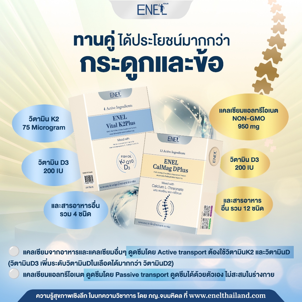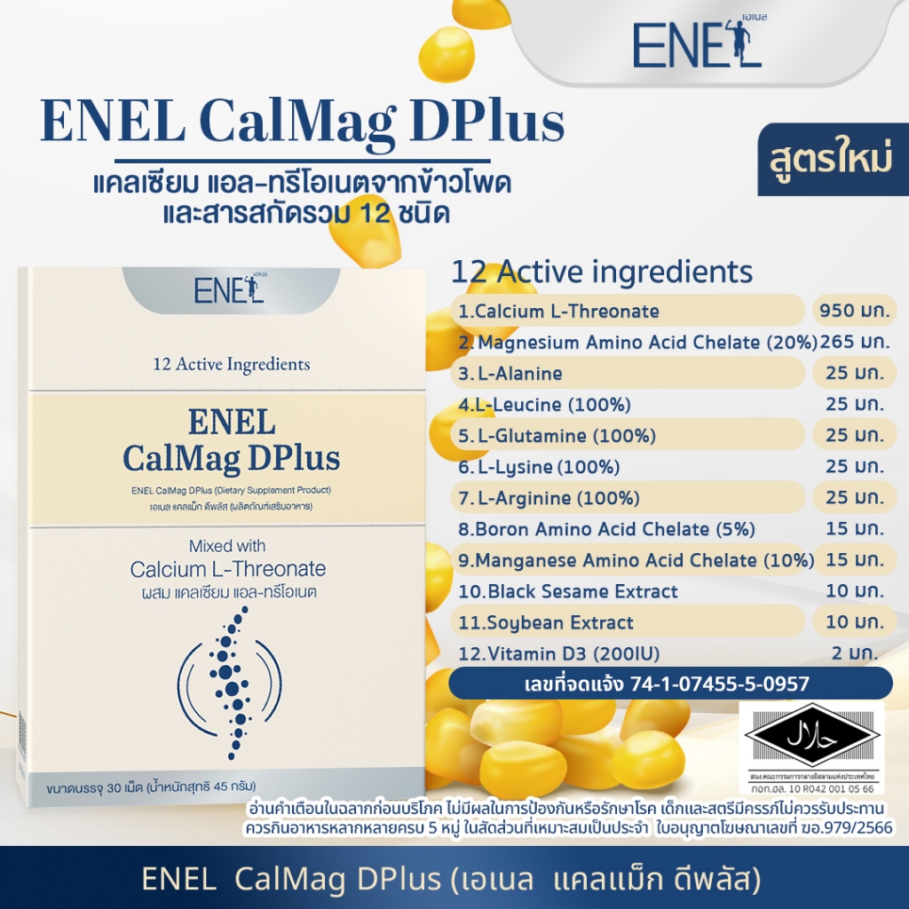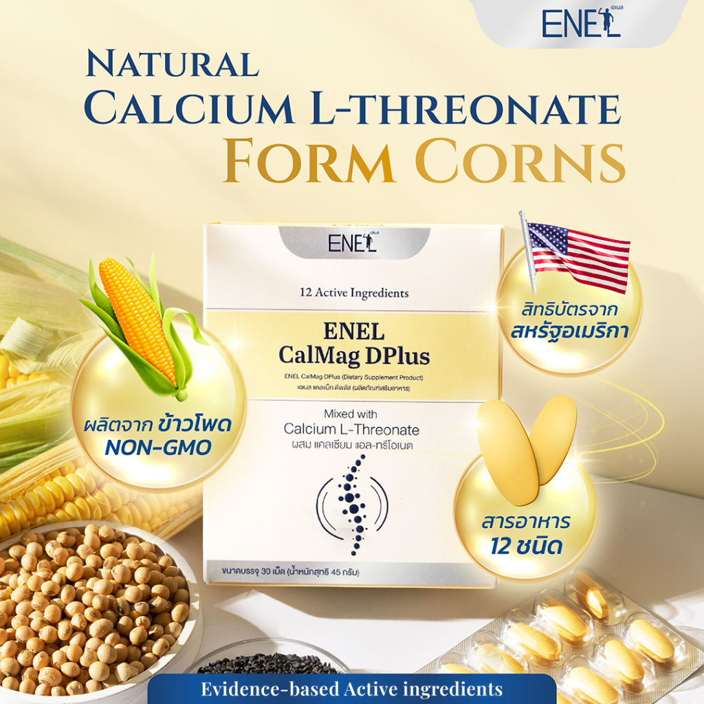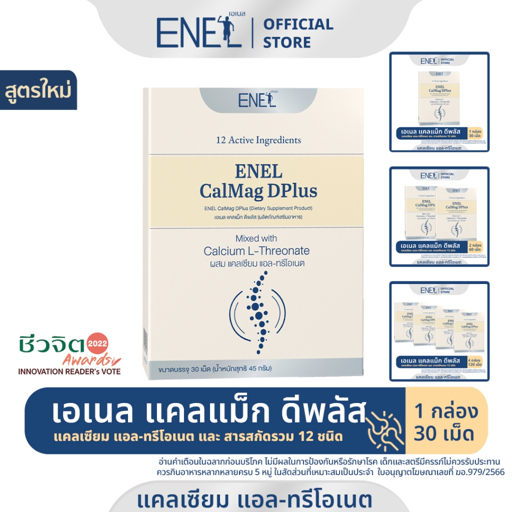 ENEL Calmag DPlus Calcium L-threonate ใส่ใจกระดูกและข้อ เอเนล แคลแม็ก ดีพลัส แคลเซียมแอลทรีโอเนต เสริมสารอาหารรวม 12 ชนิด สูตรใหม่ วิตามินดีเพิ่มขึ้น 2 เท่า สารสกัดเข้มข้นกว่าเดิม เอกสิทธิ์เฉพาะของแบรนด์เอเนล ส่วนประกอบสำคัญใน 1 เม็ด 1.Calcium L-threonate 950 มก. 2.Magnesium Amino