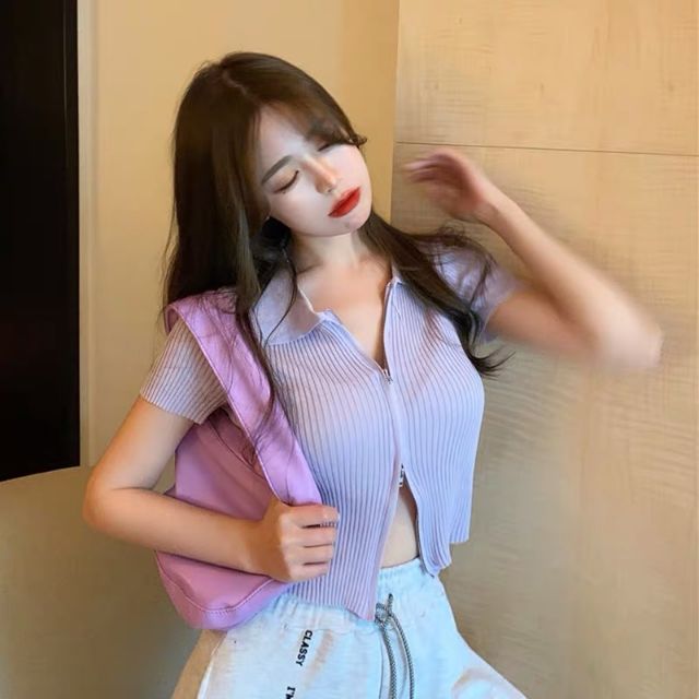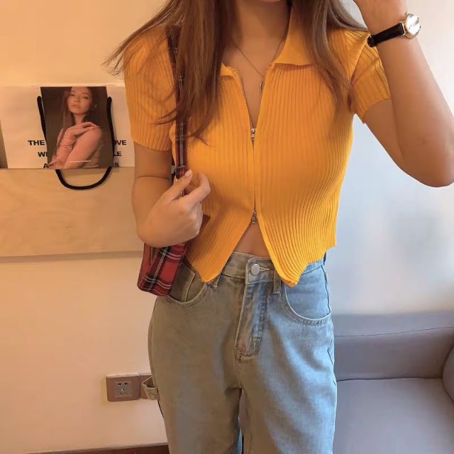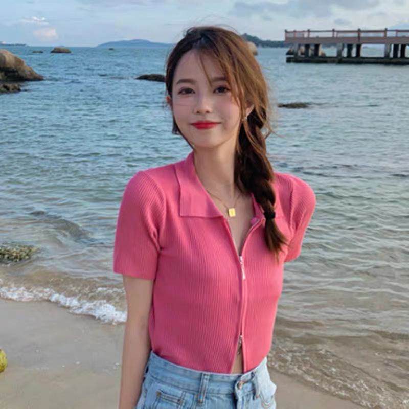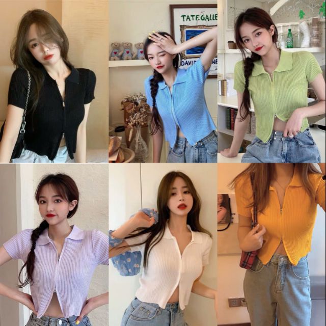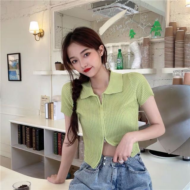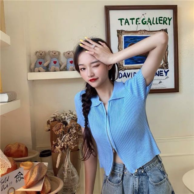 DODO🌟 พร้อมส่ง🌟เสื้อคอปกแขนสั้นไหมพรม เเต่งซิ๊บ รูดได้จริง (5930)