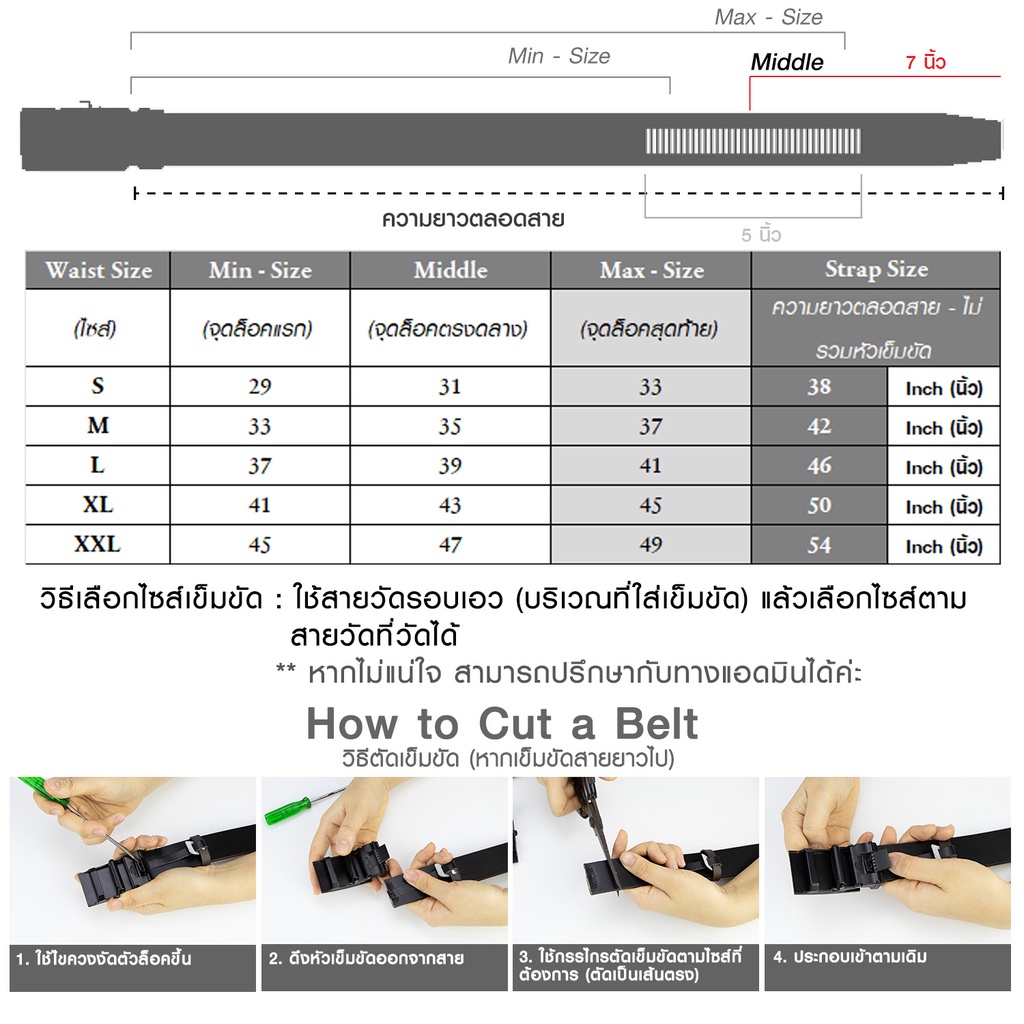 ... ข้และประเภทที่เป็นหนังเรียบ ลักษณะการใช้งานของเข็มขัดหนังแท้แบบหัวล็อคอัตโนมัติจะมีตัวขั้นบันไดปั้มอยู่บริเวณด้านล่างของสายเข็มขัด เวลาใช้งานจะทำงานร่วมกับหัวเข็มขัดแบบออโต้ล็อคเท่านั้น Description: - เข็มขัดผลิตจากหนังวัวแท้ 100% - วัสดุ: หนังวัวเรียบรูขน สายเรียบสวยตลอดเส้น - หัวเข็มขัดออโต้เมติก ผลิตจากซิงค์อัลลอย มีความทนทานสูงและมีคุณสมบัติกันสนิม - สายเข็มขัดมีขนาดความกว้าง 1.3 นิ้ว - มีความทนทานสูง ใช้งานได้ยาวนานมากกว่า 2 ปี - น้ำหนักสินค้า 206 กรัม ไซส์เข็มขัด & วิธีการวัดไซส์ ไซส์เอว : (ความยาวตั้งแต่คอเข็มขัดถึงขั้นบันไดล็อคเข็มขัด) - S: 29 – 33 นิ้ว - M: 33 – 37 นิ้ว - L: 37 – 41 นิ้ว - XL : 41 - 45 นิ้ว - XXL : 45 - 50 นิ้ว คำแนะนำ วิธีการเลือกไซส์เข็มขัด 1. เลือกไซส์ตามไซส์กางเกงที่เคยใส่ หน่วยวัดเป็นนิ้ว เช่นปกติใส่กางเกงเอว 32 นิ้ว สามารถเลือกเข็มขัดไซส์ M เวลาใส่เข็มขัดจะล็อคที่บันไดล็อคขั้นแรกของเข็มขัด 2. หากมีสายวัดใช้สายวัดรอบเอว (บริเวณที่ต้องการใส่เข็มขัด) แล้วสั่งตามไซส์ที่วัดได้ 3. หากต้องการไซส์พิเศษนอกจากไซส์ที่ระบุไว้ สามารถสั่งทำได้ เช่นต้องการ 35 นิ้ว เป็นกึ่งกลางบันไดล็อค เข็มขัดที่ได้รับจะมีเอวที่ 33-34-35-36-37 นิ้ว 4. แจ้งทางร้านก่อนส่งสินค้าออกจากร้านเท่านั้น 5. หากมีข้อสงสัยเรื่องไซส์ สามารถทักแชทสอบถามได้ก่อนสั่งซื้อ Notes: **ระยะเวลาประกันสินค้า 2 ปี** ลูกค้าสามารถเปลี่ยนสินค้าได้ ภายใน 7 วัน หากสินค้าเสียหายโดยเกิดจากกระบวนการผลิต โดยไม่เสียค่าใช้จ่ายเพิ่มเติม *หากสินค้าเสียหายจากการใช้งานของลูกค้า สามารถติดต่อผ่านทางร้านค้าเพื่อส่งซ่อมแซมฟรี ภายในระยะเวลารับประกันสินค้า (โดยลูกค้าจะได้รับ WARRANTY CERTIFICATE CARD) **สินค้าของ Louis Montini จะมาพร้อมแพ็คเก็จจิ้งสุดหรูหรา โดยจะมีกล่องใส่สินค้าและถุงผ้าใบเล็กแถมมาให้ด้วย ...สีของรูปภาพสินค้าที่แสดงบนเว็ปไซต์อาจจะแตกต่างจากสินค้าจริงเพียงเล็กน้อย เนื่องจากแสงที่ใช้ในการถ่ายภาพและการแสดงค่าสีของหน้าจอในแต่ละเครื่อง... …. การสั่งซื้อสินค้าผ่าน Louis Montini Official 1. การจัดส่งสินค้าจะจัดส่ง ทุกวันจันทร์ - วันเสาร์ โดยทางร้านจะตัดยอด ณ.เวลา 08.00 น.ของทุกวัน (หากสั่งสินค้า หลัง 08.00 น. ทางร้านจะจัดส่งให้ในวันถัดไปค่ะ (ไม่รวมวันอาทิตย์) 2. หลังจากลูกค้าโอนเงินจะใช้เวลาในการจัดเตรียมสินค้าประมาณ 1-3 วัน และใช้ระยะเวลาจัดส่ง 2-5 วัน ขึ้นอยู่กับแต่ละบริษัทขนส่ง 3. หากลูกค้ากรอกที่อยู่ผิดหรือเบอร์โทรศัพท์ผิด ทางเราจะไม่สามารถแก้ไขข้อมูลของคุณลูกค้าได้ ต้องรบกวนคุณลูกค้ากดยกเลิกแล้วสั่งเข้ามาใหม่ 4. หากสั่งไซส์ผิด ลูกค้าสามา
