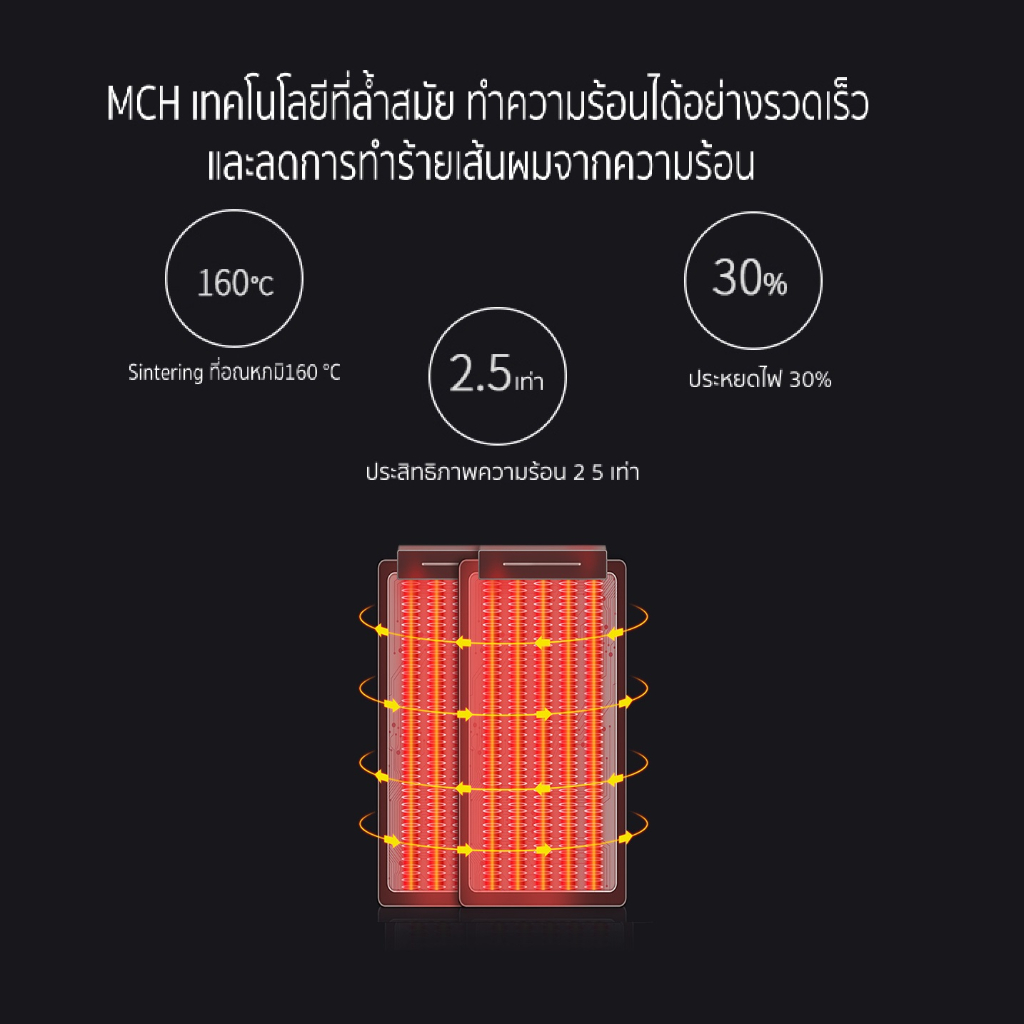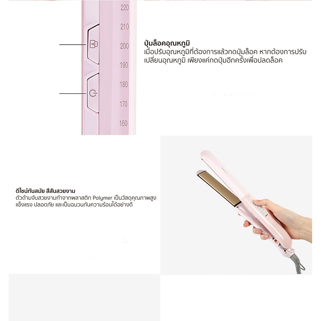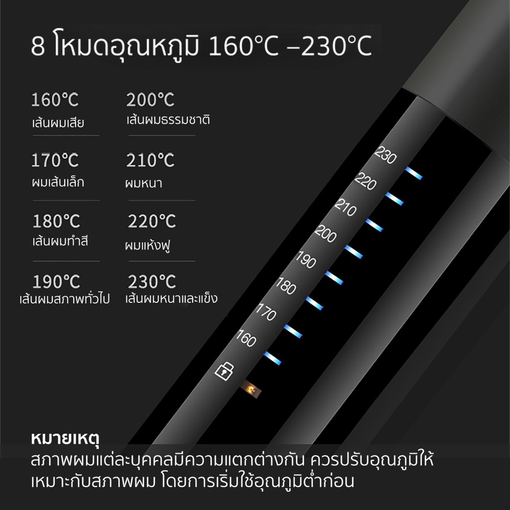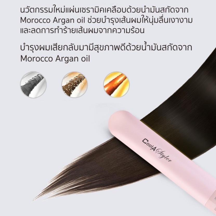 ... ⭐3.มีประกันอุบัติเหตุที่เกิดจากตัวสินค้า รับประกันโดย : บริษัท เอไอจี (AIG) ประกันภัย (ประเทศไทย) จำกัด (มหาชน) ⭐การออกแบบไม่ทำร้ายเส้นผม⭐ ⭐มีระบบ Safety เพิ่มเทคโนโลยีตัดไฟอัตโนมัติ เมื่อคุณลืมเครื่อง ระบบจะปิดเองอัตโนมัติหลังจากไม่ได้ใช้งาน 60 นาที 🌟coolastyler เครื่องหนีบผมควบคุมด้วยระบบสัมผัส มาพร้อมเทคโนโลยีประจุไอออนลบ ดีไซน์ที่ลงตัว สวยทุกมุมมอง 🌟Morocco Essential oil 🌟ประจุไอออนลบ 🌟ระบบสัมผัสอัจฉริยะ 🌟ร้อนเร็วพร้อมใช้งานใน 12 วินาที 🌟ปรับอุณหภูมิได้ 8 ระดับ 🌟จัดแต่งผมได้ทั้งแบบลอนและแบบตรง 🌟นวัตกรรมใหม่แผ่นเซรามิคเคลือบด้วยน้ำมันสกัดจาก Morocco Argan oil ช่วยบำรุงเส้นผมให้นุ่มลื่นเงางาม และลดการทำร้าย เส้นผมจากความร้อน บำรุงผมเสียกลับมามีสุขภาพดีด้วยน้ำมันสกัดจาก Morocco Argan oil🌟 🌟ประจุไอออนลบช่วยให้ผมที่แห้งชี้ฟูกลับมามีประกายเงางาม ตัวประจุไอออนลบสามารถปล่อยประจุได้ถึง 3 ล้านตัว/cm3 มากกว่าเครื่องหนีบผมทั่วไป ช่วยบำรุงรักษาให้ผมสุขภาพดี เงางาม และป้องกันไฟฟ้าสถิต ลดปัญหาผมแตกปลายชี้ฟู และให้ เกล็ดผมกลับมาปิดสนิท🌟 🌟ผมชุ่มชื้น 🌟ป้องกันไฟฟ้าสถิต 🌟ไม่ทำให้ผมแตกปลายชี้ฟู 🌟CoolAstyler เทคเทคโนโลยีระบบสัมผัสบนเครื่องหนีบผม สร้างสรรค์เพื่อการใช้งานง่าย ตอบสนองความต้องการของคุณ ทั้งมีเทคโนโลยี Capacitive touch screen เช่นเดียวกับ iPad ช่วย ให้ใช้งานง่ายด้วยปุ่มสัมผัสที่มีความเสถียนแม่นยำ และไวต่อทุก การสัมผัส 🌟ระบบสัมผัสอัจฉริยะ 🌟 ไวต่อการสัมผัส 🌟ปรับอุณหภูมิง่ายและ รวดเร็ว 🌟8 โหมดหลักอุณหภูมิการจัดแต่งผม ออกแบบมาเพื่อให้เหมาะกับ ทุกสภาพเส้นผม 🌟8 โหมดอุณหภูมิ 160°C –230°C 160 °C เส้นผมเสีย 🌟170 °C ผมเส้นเล็ก 🌟180 °C เส้นผมทำสี 🌟190 °C เส้นผมสภาพทั่วไป หมายเหตุ 🌟200 °C เส้นผมธรรมชาติ 210 °C ผมหนา 🌟220 °C ผมแห้งฟู 🌟230 °C เส้นผมหนาและแข็ง 🌟สภาพผมแต่ละบุคคลมีความแตกต่างกัน ควรปรับอุณภูมิให้ เหมาะกับสภาพผม โดยการเริ่มใช้อุณภูมิต่ำก่อน 🌟ทำความร้อนรวดเร็ว พร้อมใช้ภายใน 12 วินาที และเพียง 10 วินาทีสำหรับเพิ่มอุณหภูมิอีกระดับ มีระบบรักษาอุณหภูมิให้คงที่อัตโนมัติ เพื่อปกป้องเส้นผมถูก ทำร้ายจากอุณหภูมิที่ไม่สม่ำเสมอ🌟 🌟แผ่นเซรามิคเคลือบเงาที่เพิ่มความเรียบลื่นมากขึ้น เพื่อลดการเสียดสีและไม่ทำร้ายเส้นผม สปริงยางซิลิโคนออกแบบเพื่อแรงกดที่สม่ำเสมอทั่วถึงทั้งแผ่น จัดทรงผมง่าย และทำให้เส้นผมดูเป็นธรรมชาติมากยิ่งขึ้น🌟 🌟ซิลิโคนคุณภาพสูง 🌟ผมลื่นไม่พันกัน 🌟 เส้นผมเป็นรอนธรรมชาติ 🌟แผ่นเซลามิคเคลือบสารหล่อลื่นรอบด้าน เพิ่มความความรู้สึก เรียบลื่นในการใช้งาน 🌟สปริงยางซิลิโคนทั