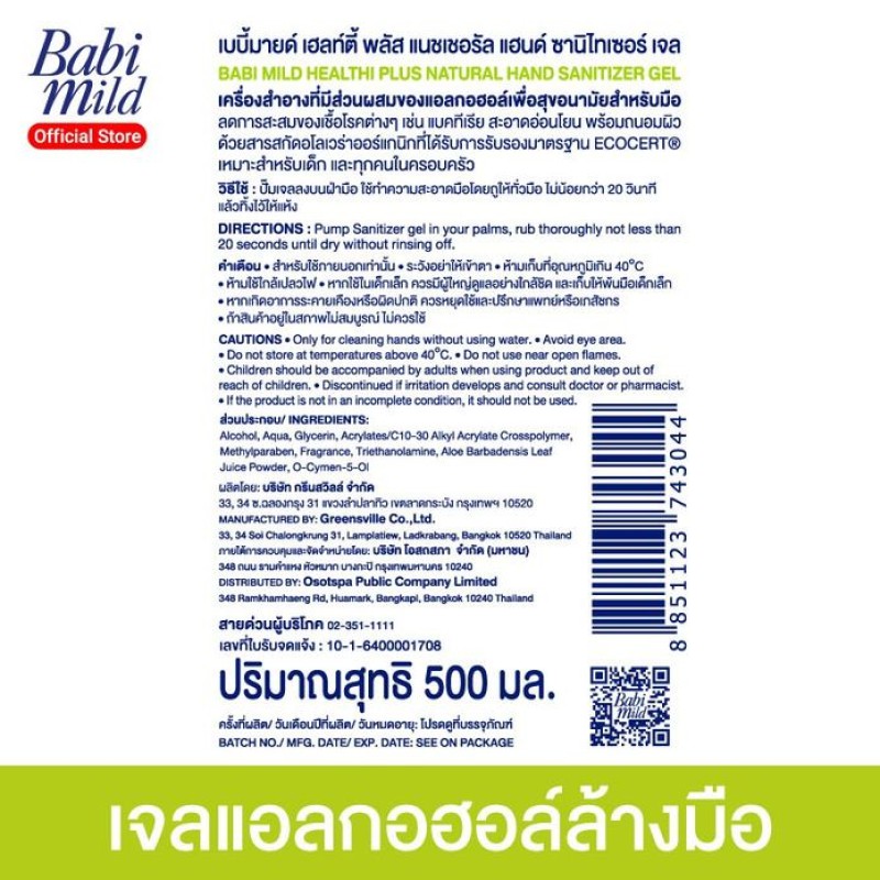 เบบี้มายด์ เจลล้างมือ แอลกอฮอล์ ขวดปั๊ม 500 มล. x2 / Babi Mild Hand Sanitizer Gel 500 ml.x2
