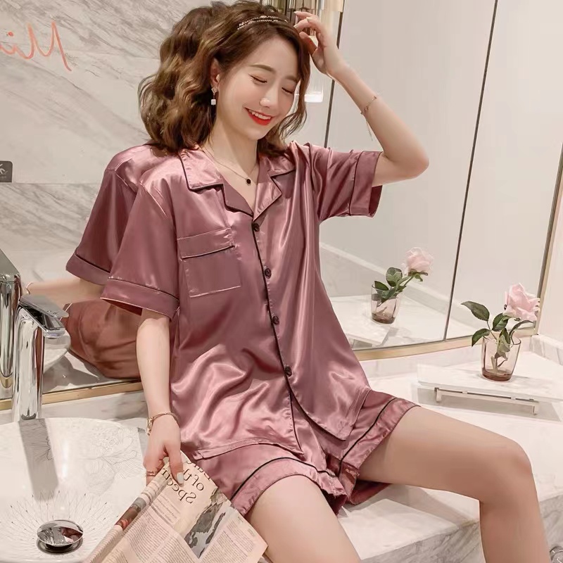 3333 E ชุดนอนสตรีแบบแขนสั้นติดกระดุมด้านหน้า ชุดนอนผ้าซาติน ลื่นไม่ยับง่ายมีหลายไซส์หลายสีให้เลือก สินค้านำเข้า