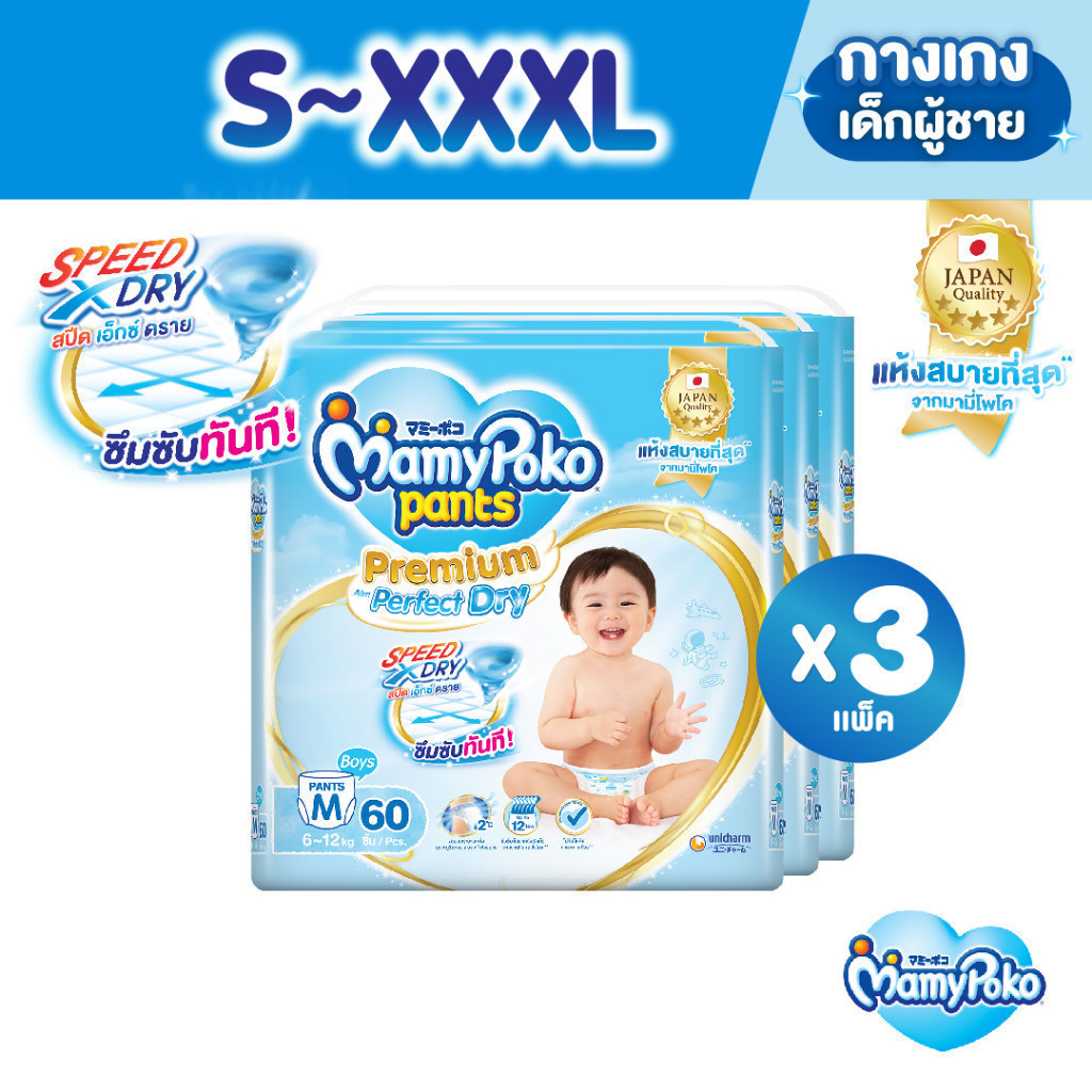 MamyPoko มามี่โพโค แพ้นท์ พรีเมี่ยม เอม เพอร์เฟกต์ ดราย ไซส์ S-XXXL x3 แพ็ค