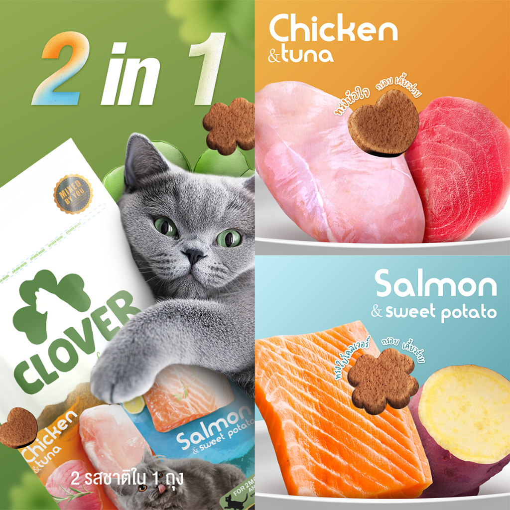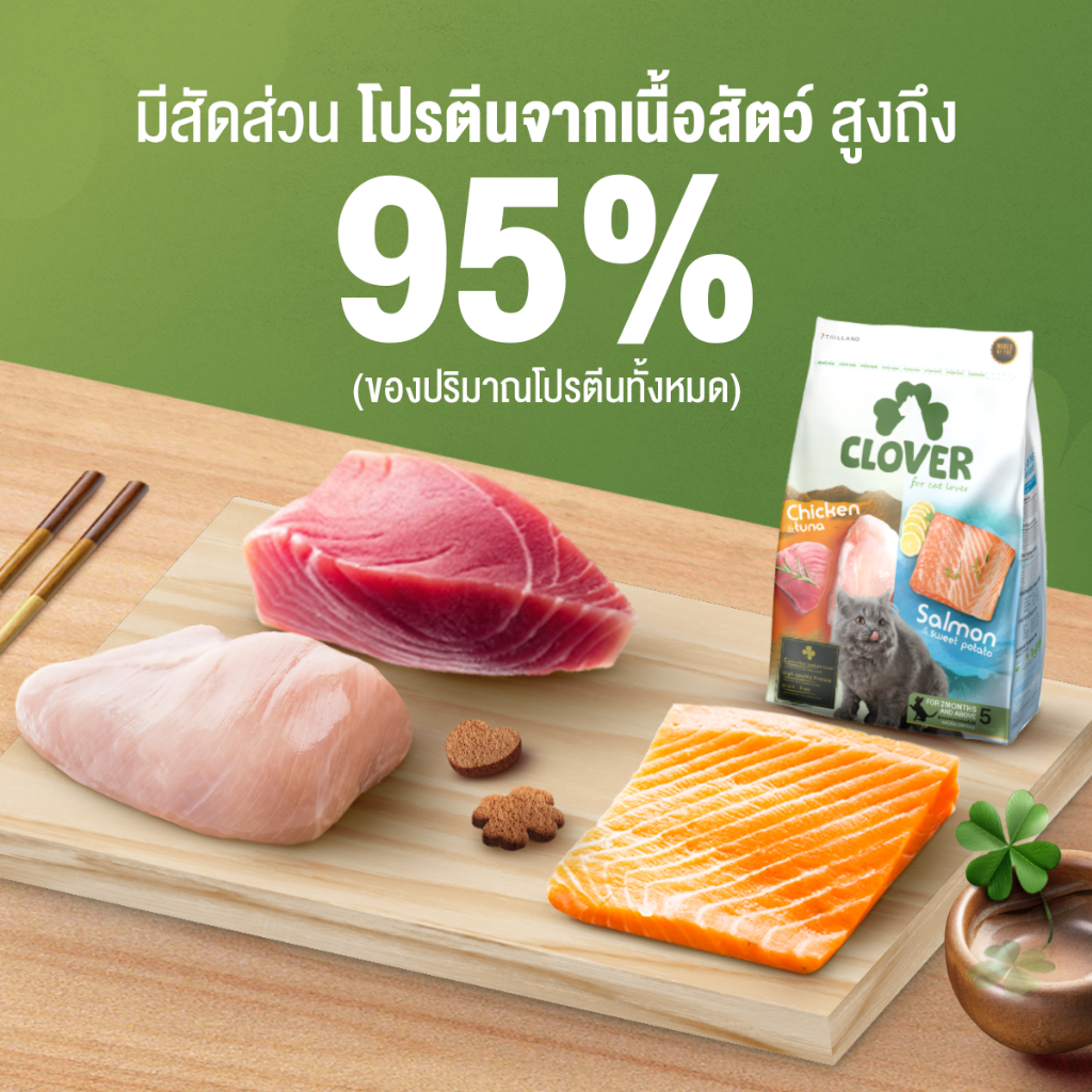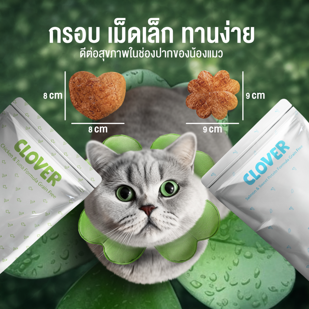 ... เงินให้ 100% ––– ✅ สัดส่วนโปรตีนจากเนื้อสัตว์สูงถึง 95% ✅ ไม่ใช้ผลพลอยได้สัตว์ ✅ ไม่มีธัญพืช ✅ โซเดียมต่ำ ถนอมไต ไม่ใส่เกลือ ✅ มีถึง 4 ส่วนผสมคุณภาพในสูตรเดียว (ไก่ ทูน่า แซลมอน มันฝรั่งหวาน) - สำหรับน้องเหมียว 2 เดือนขึ้นไป - เม็ดเล็ก ทานง่าย ดีต่อสุขภาพฟัน 📌 **มาตรการคืนเงินจะมีเฉพาะ Clover ขนาด 3 กก. ขึ้นไปเท่านั้น**📌 ––– 🐈 ส่วนผสมหลัก - ทูน่าสายพันธุ์เกาหลี ไต้หวัน และ Western Pacific - ไก่พรีเมียม - แซลมอนจากฝรั่งเศส - มันฝรั่งหวาน - สารสกัดยัคค่า (ช่วยลดกลิ่นอึ กลิ่นฉี่) 🐈 คุณประโยชน์หลัก - ตัวแน่น ถนอมไต - ป้องกัน hairballs ด้วยไฟเบอร์ที่สูง - ลดขนร่วง ปัญหาผิวหนัง ขนสวย เงางาม - บำรุงระบบดูดซึม ระบบขับถ่าย ระบบประสาท - ให้พลังงานที่จำเป็น โปรตีนไม่สูงเกินไปจนดูดซึมไม่หมด อันเป็นสาเหตุของปัญหาสุขภาพในระยะยาว - ลดกลิ่นขับถ่าย - ดีต่อสุขภาพในระยะยาว 🏆 ได้รับการรับรองคุณภาพและโภชนาการจาก GMP, HACCP, AAFCO น้องแมวที่อายุมากกว่า 2 เดือนขึ้นไปสามารถทาน Clover ได้เลยค่ะ เม็ดเล็ก เคี้ยวง่าย ดีต่อสุขภาพฟัน เหมาะกับแมวทุกสายพันธุ์ ---- วันหมดอายุ: เก็บได้ประมาณ 1 ปีค่ะ ** จัดส่งทุกวันจันทร์-ศุกร์ค่ะ ตัดรอบทุก 9 โมงเช้านะคะ (ออเดอร์วันศุกร์ที่สั่งหลัง 9 โมง จะจัดส่งวันจันทร์นะคะ) 🚛 ----------- ขั้นตอนการเปลี่ยนอาหารแมวมาเป็น Clover 🍀 เนื่องจากระบบย่อยอาหารของแมวมีจุลินทรีย์น้อยกว่าของมนุษย์ น้องแมวจึงมีความ sensitive ต่ออาหาร หากเปลี่ยนทันทีทันใด น้องอาจจะท้องเสีย อาเจียน หรืออาจไม่ยอมทานเลย ดังนั้นรบกวนคุณลูกค้าค่อย ๆ เปลี่ยนอาหารดังนี้นะคะ 1. วันแรกให้ผสม Clover ในอัตราส่วน 10-20% กับอาหารเดิมที่น้องแมวเคยทานอยู่ 2. จากนั้นวันที่ 5 จึงค่อย ๆ เพิ่มอัตราส่วนของ Clover ขึ้นค่ะ 3. แนะนำให้ใช้ระยะเวลาเปลี่ยนอาหารประมาณ 15 วันนะคะ