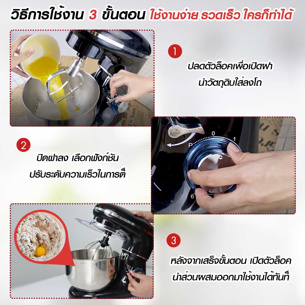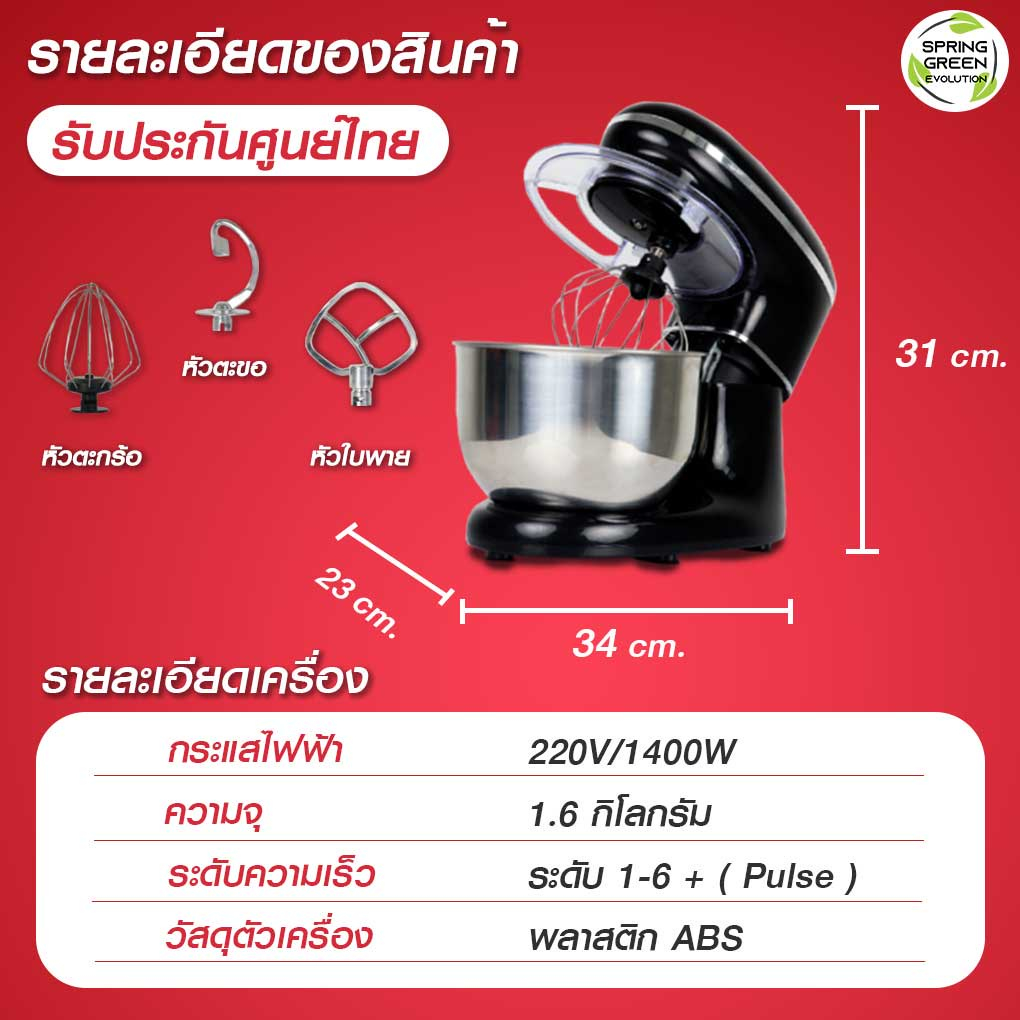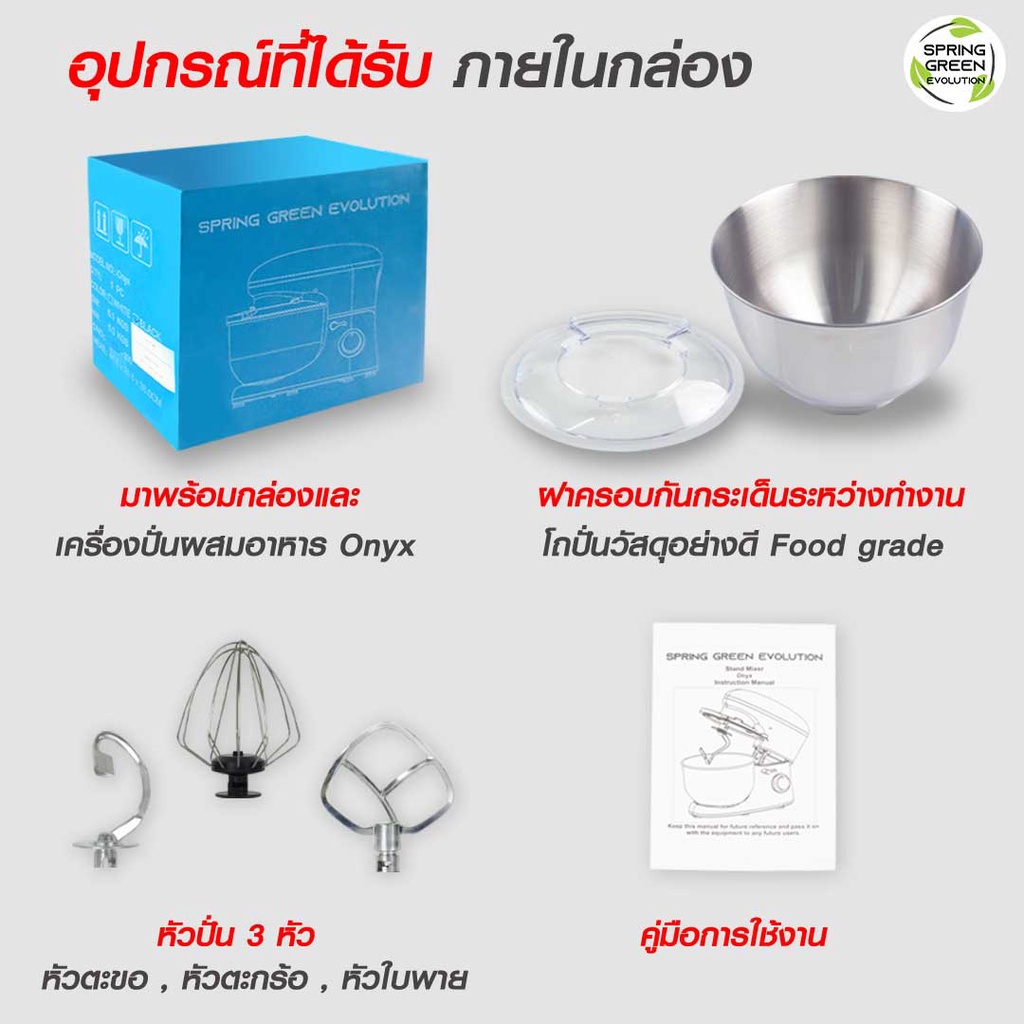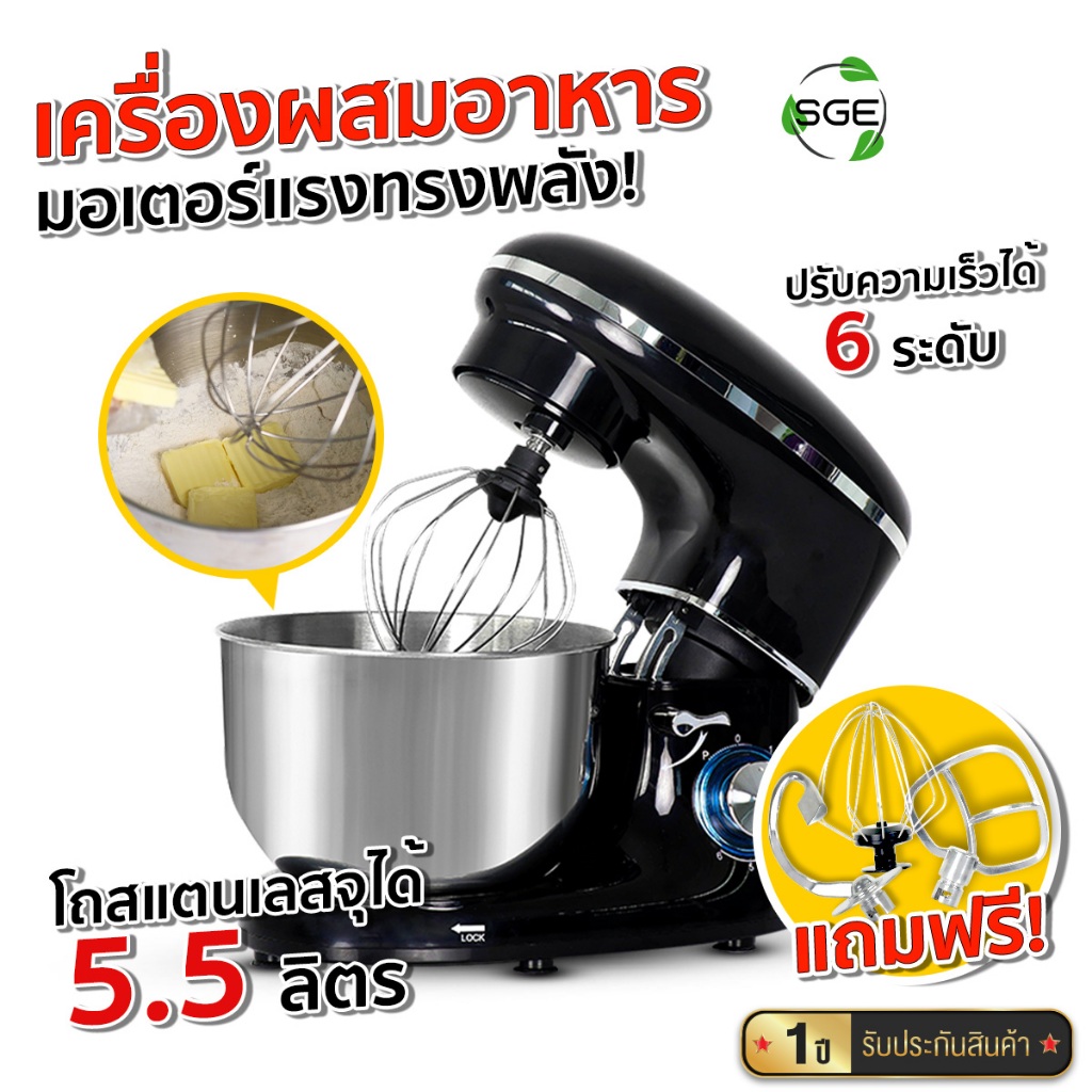 ... ึง 6 ระดับ เช่น ตีไข่ นวดแป้ง ตีส่วนผสมให้เข้ากัน ช่วยให้งานเบเกอรี่ ทำขนม หรือประกอบอาหาร มีความแม่นยำ และง่ายขึ้น!!! 👍👍 ⭐️⭐️⭐️ผ่านการรับรองมาตรฐาน TUV , FDA จากยุโรปและอเมริกา⭐️⭐️⭐️ ✨ จุดเด่น ✨ ✔️ ทรงพลัง ด้วยกำลังไฟ 1400 วัตต์ ✔️ มอเตอร์ทองแดงแท้ 100% ใช้งานทนทาน แข็งแกร่ง ✔️ ปรับความเร็วได้ตามต้องการ ถึง 6 ระดับ และ 1 Pulse ✔️ โถทำจากสแตนเลส 304 ความจุ 5.5 ลิตร ✔️ มาพร้อมหัวตี 3 แบบ ทั้ง หัวตะกร้อ หัวใบพาย และหัวตะขอ ✔️ ฐานแข็งแรง มั่นคง รองรับแรงเหวี่ยงได้ดี ✔️ มีช่องระบายความร้อน เพื่ออายุการใช้งานของมอเตอร์ ✔️ ผสมอาหารได้เร็วกว่า ประหยัดทั้งเวลา และแรงงาน ⚠️ อุปกรณ์ในกล่อง⚠️ 1. เครื่องผสมอาหาร 2. โถสแตนเลส 3. ฝาพลาสติกสำหรับปิดโถ 4. หัวตีแบบตะกร้อ 5. ตัวตีแบบตะขอ 6. หัวตีแบบใบพาย 7. คู่มือการใช้งาน 8. ปลั๊ก ✅ ขนาดและรายละเอียดของสินค้า ✅ พลังงานไฟฟ้า 1400w กระแสไฟฟ้า 220v ความจุ 5.5ลิตร ขนาดตัวเครื่อง 23 x 34 x 31 ซม. ระดับความเร็วสูงสุด 205รอบ/นาที ระดับความเร็วปกติ 35รอบ/นาที วัสดุ สแตนเลส 304, พลาสติก ABS, ทองแดงบริสุทธิ์ การรับประกัน ตัวเครื่อง 1 ปี ======================================================= ☆ ☆ ☆ รับประกันสินค้า 1 ปี ตามเงื่อนไขที่กำหนด ☆ ☆ ☆ ☆ ☆ ☆ รับประกันเปลี่ยนเครื่องภายใน 7 วัน ☆ ☆ ☆ ======================================================= เหมาะสำหรับตีไข่ ทำเค้ก ผสมแป้งคุกกี้ หรือ ผสมอาหารสามารถตีแป้งให้เป็นเนื้อเดียวกันได้อย่างแน่น SPEED LEVEL (ปรับระดับความเร็ว เครื่องผสมแป้ง Onyx) มอเตอร์ทองแดง มอเตอร์ ทองแดงแท้ 100% สามารถทนความร้อนได้ สูง ใช้งานได้อย่างยาวนานมากขึ้น เฟืองเหล็ก เฟืองเหล็กแข็งแรง ทนทาน สามารถรับแรง หมุน ได้มากขึ้น คุณสมบัติของ เครื่องผสมอาหาร เครื่องผสมแป้ง Onyx โถ ผสมอาหารเนื้อสเตนเลสอย่างดี ไม่ก่อให้เกิดสนิม ขนาด 5.5 ลิตร ------------------------------------------------------------------------------------------------------------------------------------------------------------------------------------------- 📍ลูกค้าสามารถนัดหมายเพื่อเข้าชมหรือทดลองสินค้าจริง เครื่องซีลสูญญากาศ และสินค้าอื่น ๆ ของ SGE ได้ฟรี! ที่ Showroom ทั้ง 2 สาขา📍 📌 สาขาสาทร (สำนักงานใหญ่) ที่ตั้ง 658 ซ.เจริญกรุง 67 ยานนาวา สาทร กรุงเทพฯ 📌 สาขาภูเก็ต ที่ตั้ง 1120 ถนน วิเศษ ตำบล ราไวย์ อำเภอเมืองภูเก็ต ภูเก็ต 83100 ------------------------------------------------------------------------------------------------------------------------------------------------------------------------------------------- #standmixer #เครื่องผสมอาหาร #เครื่องตีไข่ #เครื่องตีแป้ง #เครื่องผสมแป้ง