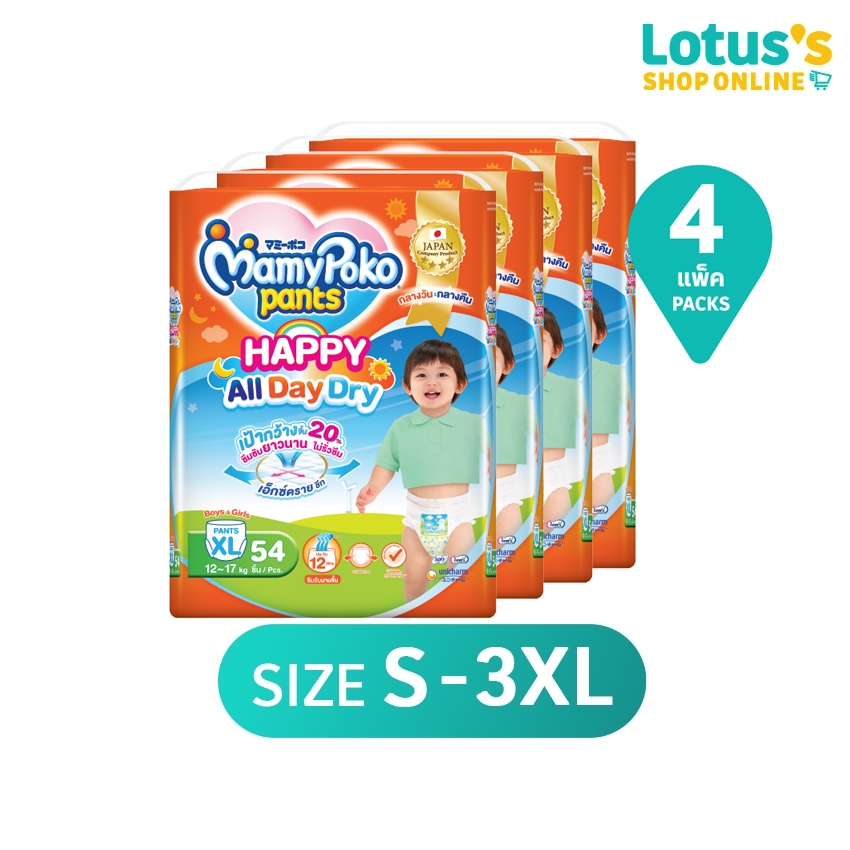 ... RY) ไซส์ M 74 ชิ้น ลังละ 296 ชิ้น (HAPPY ALL DAY DRY) ไซส์ L 62 ชิ้น ลังละ 248 ชิ้น (HAPPY ALL DAY DRY) ไซส์ XL 54 ชิ้น ลังละ 216 ชิ้น (HAPPY ALL DAY DRY) ไซส์ XXL 48 ชิ้น ลังละ 192 ชิ้น (HAPPY ALL DAY DRY) ไซส์ 3XL 28 ชิ้น ลังละ 112 ชิ้น (HAPPY ALL DAY DRY) MamyPoko Pants Happy All Day Dry ผ้าอ้อมแบบกางเกง ราคาประหยัด ใช้ได้ทั้งกลางวันและกลางคืน ซึมซับได้นานถึง 8 ชั่วโมง พร้อมแผ่นระบาย อากาศ ช่วยคลายกังวลเรื่องความอับชื้นและขอบขา 2 ชั้น ป้องกันการรั่วซึม ช่วยให้ลูกน้อยมีความสุขตลอดวัน คุณสมบัติของผ้าอ้อม ซึมซับได้นานถึง 8 ชั่วโมง ใช้ได้ทั้งกลางวันและกลางคืน *ระยะเวลาการซึมซับ ขึ้นอยู่กับปริมาณปัสสาวะของลูกน้อยแต่ละคน แผ่นระบายอากาศ มีแผ่นระบายอากาศ ที่ช่วยคลายกังวลเรื่องความอับชื้น ลูกน้อยสบายตัวตลอดวัน ขอบขาซูเปอร์ล็อก กระชับพอดีตัว ป้องกันการรั่วซึม สำหรับ Size L-3XL จะเป็นขอบขา 2 ชั้น ป้องกันการรั่วซึม สวมง่ายแบบกางเกง สวมง่ายใส่สบายด้วย ผ้าอ้อมแบบกางเกง *ภาพสินค้าเป็นเพียงตัวอย่าง สินค้าจริงอาจแตกต่างจากภาพเล็กน้อย