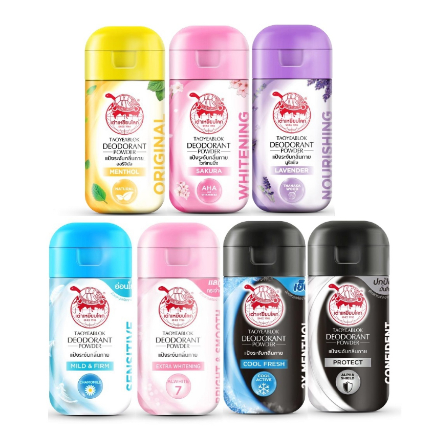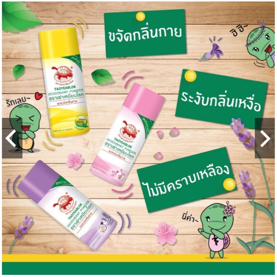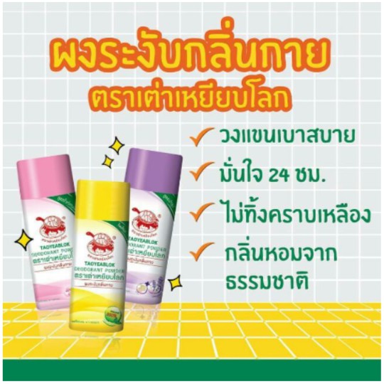 ... ้า - เต่าเหยียบโลก แป้งระงับกลิ่นกาย - มีส่วนผสมจากสมุนไพรธรรมชาติ 100% - แห้งสบาย ระงับกลิ่นกายได้ยาวนานตลอดทั้งวัน - ไม่มีส่วนผสมของแอลกอฮอลล์ ไม่ทำให้รักแร้ดำ - ขนาด 22 กรัม มีให้เลือก 7 สูตร - สูตรออริจินัล กลิ่นเมนทอล - สูตรไวท์เทนนิ่ง กลิ่นซากุระ ให้ผิวดูกระจ่างใสจากวิตามินบี 3 และ AHA - สูตรนูริชชิ่ง กลิ่นลาเวนเดอร์ ให้ผิวชุ่มชื่นกระจ่างใสจากทานาคา - สูตรมายด์ & เฟิร์ม กลิ่นแป้งเด็ก อ่อนโยนสำหรับเด็ก หรือผู้ที่แพ้ง่าย - สูตรโพรเทค กลิ่นน้ำหอมแบรนด์เนม ระงับกลิ่นสำหรับผู้ชาย - สูตรเอ็กซ์ตร้า ไวท์เทนนิ่ง กลิ่นน้ำหอมยุโรป ช่วยยับยั้งการสังเคราะห์เม็ดสี - สูตรคูลเฟรช กลิ่นน้ำหอมแบรนด์เนม เย็นกว่าสูตรออริจินัล 3 เท่า เย็น สดชื่น
