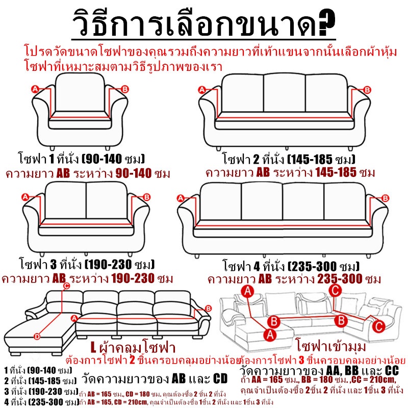... าน 2. Washmachine ล้างทำความสะอาดได้และติดตั้งและลบได้ง่ายมาก 3. มันทำจากวัสดุยืดหยุ่นเหมาะอย่างยิ่งสำหรับโซฟาส่วนใหญ่ 4. ปกป้องโซฟาของคุณจากคราบสัตว์เลี้ยงผมความเสียหายและฝุ่นละออง 5. เหมาะสำหรับบ้าน, โรงแรมและสำนักงานและต้องการโซฟาสถานที่ใด ๆ 6. ผลิตภัณฑ์ไม่ได้มาพร้อมกับหมอนและปลอกหมอน 7.แท่งโฟมสามารถทำให้โซฟาติดตั้งได้ดีขึ้น ⭐รายละเอียด: วัสดุ: สแปนเด็กซ์ + โพลีเอสเตอร์ ขนาด: 1/2/3/4 ที่นั่ง สี: ตามที่แสดงในภาพ สไตล์: ความเรียบง่ายทันสมัย 💕วิธีการเลือกขนาดสำหรับครอบคลุมโซฟาของคุณ? กรุณาวัดขนาดที่เหมาะสมของโซฟาของคุณก่อนสั่งซื้อ และควรเลือกผ้าหุ้มโซฟาขนาดใหญ่กว่าเล็กน้อยสำหรับโซฟาของคุณ 🌟สำหรับโซฟา 1-4 ที่นั่ง:(คุณต้องซื้อปกโซฟา 1 ผืน) โปรดวัดความยาวของ AB (รวมถึงที่เท้าแขนด้วย) โซฟา 1 ที่นั่ง = 90-140 ซม. (35-55 นิ้ว) โซฟา 2 ที่นั่ง = 145-185 ซม. (57-73 นิ้ว) โซฟา 3 ที่นั่ง = 190-230 ซม. (75-91 นิ้ว) โซฟา 4 ที่นั่ง = 235-300 ซม. (93-118 นิ้ว) 🌟สำหรับโซฟารูปตัว L (คุณต้องซื้อผ้าหุ้มโซฟา 2 ผืน) โปรดวัดความยาวของ AB (รวมถึงที่เท้าแขนด้วย) ถ้า AB = 190 ซม. CD = 240 ซม. คุณสามารถเลือกโซฟา 3 ที่นั่งและโซฟา 4 ที่นั่ง 🌟สำหรับโซฟาตัด:(คุณต้องซื้อฝาครอบโซฟา 3-4 ชิ้น) โปรดวัดความยาวของ AA, BB และ CC (รวมถึงที่เท้าแขนด้วย) ถ้า AA = 200 ซม., BB = 240 ซม., CC = 150 ซม. คุณสามารถเลือกโซฟา 3 ที่นั่ง + โซฟา 4 ที่นั่ง + โซฟา 2 ที่นั่ง 💕 โปรดทราบ: 1. ฝาครอบโซฟานี้ใช้กับโซฟาที่มีช่องว่างระหว่างที่นั่งกับพนักพิงและที่เท้าแขน (โปรดตรวจสอบให้แน่ใจว่าโซฟาของคุณมีช่องว่างลึกเพื่อสลิปบาร์โฟมก่อนซื้อฝาครอบโซฟาของเราไม่เหมาะสำหรับโซฟาที่มีตื้น ช่องว่าง.) 2. กรุณาวัดโซฟาของคุณรวมถึงที่เท้าแขนจากนั้นเลือกขนาดถ้าคุณไม่วัดมันโซฟาหุ้มจะเล็กกว่าโซฟาของคุณ 3. เนื่องจากชุดการผลิตที่แตกต่างกันอาจจะมีการเบี่ยงเบนของ 1--3 เซนติเมตรสำหรับรายการ 4. เนื่องจากปัญหาการขนส่งทางไกล, ผลิตภัณฑ์จะเป็นพับเล็กน้อย, มันอาจจะไม่แบนเป็นภาพ, แต่ไม่มีผลต่อการใช้ของ 5. สีบนหน้าจอคอมพิวเตอร์ของคุณอาจแตกต่างกันเล็กน้อยจากผลิตภัณฑ์จริงสีของคุณตรวจสอบการตั้งค่า