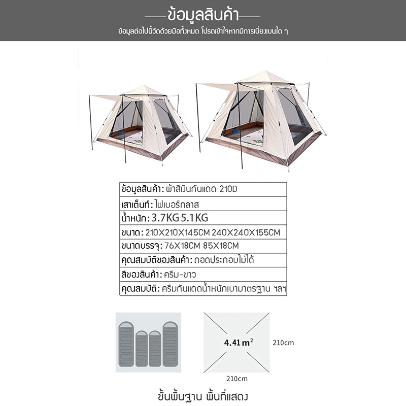 *สินค้าพร้อมส่งจ้า (เช็คสต็อคทุกวัน) สามารถกดสั่งซื้อได้เลยครับ รายละเอียดสินค้า DIY SIAM เต็นท์นอน 3-4 คน ขนาด ขนาด 215x215x142 ซม. คือ การวัดขนาดใช้งานตัวเต็นท์จริง อาจมีส่วนต่างเล็กน้อย ที่วัดรวมการดึงตึงผ้าเต้นและที่ปักสมอบกเพื่อยึดติดกับพื้นดิน ขนาด 240x240x155 ซม. คือ การวัดขนาด