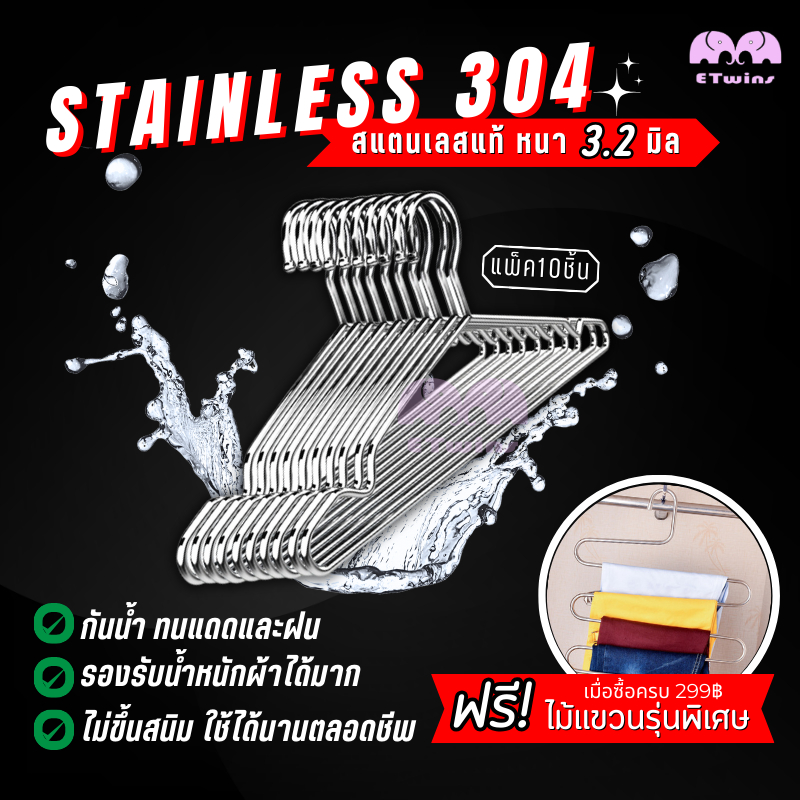 ไม้แขวนเสื้อ สแตนเลส 304แท้ หนา3.2mm / 3mm / 2.7mm 1แพ็คมี10ชิ้น แขวนผ้า กางเกง แข็งแรง คุณภาพดี ทนทาน etwins รับประกัน