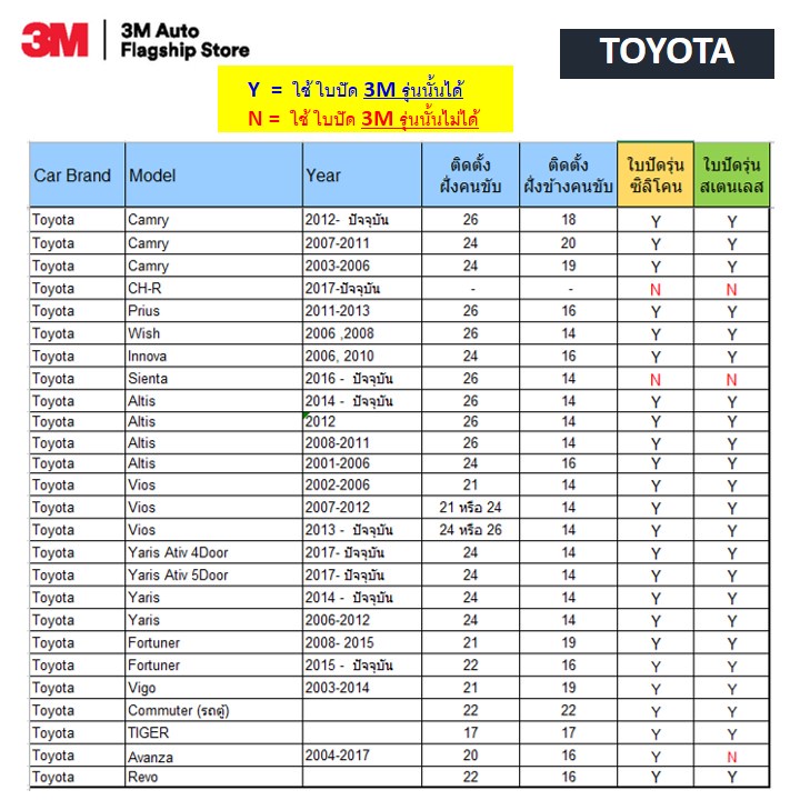 3M ใบปัดน้ำฝน รุ่นซิลิโคน Frameless แนบสนิทปัดน้ำฝนได้ดีเยี่ยม 🎉 รบกวนลูกค้าพิจารณา ก่อนกดสังซื้อนะคะ ⚠️ รายการสินค้าใบปัดน้ำฝน จะจำหน่าย 1 แพ็ค ต่อ 1 ก้าน นะคะ ⚠️ อายุของใบปัดหากเก็บในแพ็คแก็จ ยังไม่แกะใช้งานมีอายุ 5 ปี นับจากปีผลิต แต่หากเปิดใช้งานแล้วจะมีอายุ 8-12 เดือน ⚠️ ขนาดใบปัดน้ำฝนใน