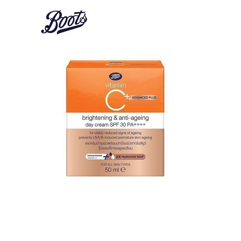 BOOTS VITAMIN C บู๊ทส์ วิตามิน ซี แอดวานซ์ พลัส ไบร์ทเทนนิ่ง แอนด์ แอนตี้-เอจจิ้ง เดย์ ครีม เอสพีเอฟ30 พีเอ++++ 50มล