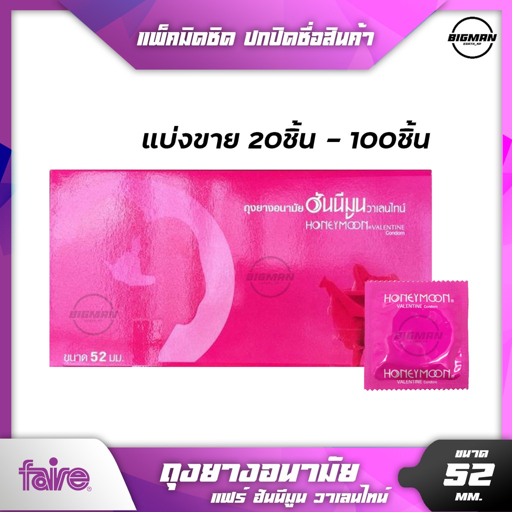 ถุงยางอนามัย52มม แบ่งขาย 20-100ชิ้น Faire Honeymoon Valentine Condom ถุงยาง52 ฮันนีมูน วาเลนไทน์ ผิวเรียบ ราคาถูก