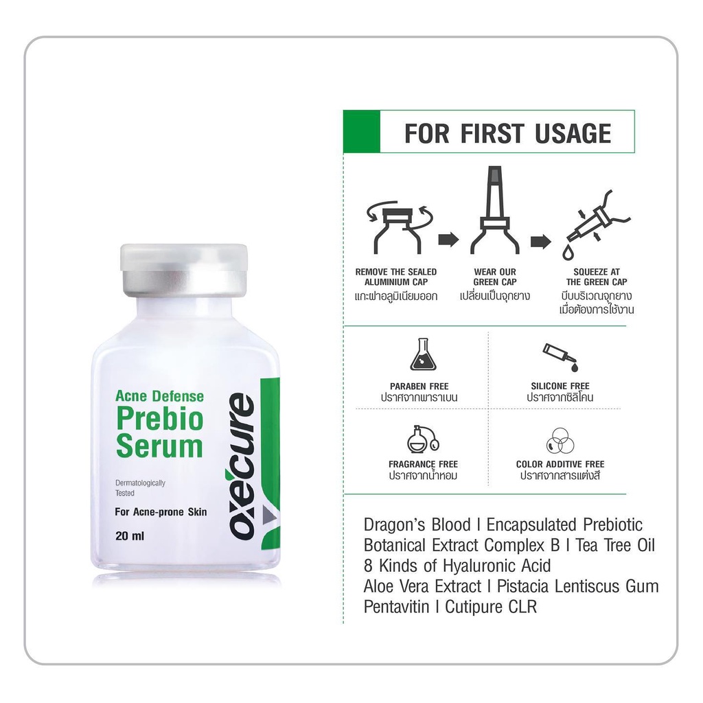 🌟 อ๊อกซีเคียว แอคเน่ ดีเฟนส์ พรีไบโอ เซรั่ม 20 มล. 🌟 FG-01-012-0100 (10OX00105) 🌟 เซรั่มเข้มข้นในรูปแบบขวดแก้ว Ampoule อุดมด้วยส่วนผสมของ Dragon's blood และ Botanical Extract Complex B ช่วยบำรุงผิวบริเวณที่มีรอยสิวและหลุมสิวให้ดูจางลงใน 1 สัปดาห์* ผสานนวัตกรรม Encapsulated Prebiotic ช่วยฟื้น