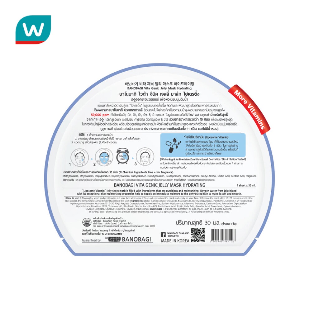 รายละเอียดสินค้า บาโนบากิ ไวต้า จีนิค เจลลี่ มาส์ก ไฮเดรติ้ง แผ่นมาส์กหน้าวิตามินสูตร ไฮเดรติ้ง ในรูปแบบเจลลี่เซรั่ม คิดค้นและพัฒนาสูตรโดยทีมแพทย์ผิวหนังจากโรงพยาบาลบาโนบากิ ประเทศเกาหลี ด้วยเทคโนโลยีการกักเก็บวิตามินบำรุงผิวนานาชนิด ที่มีปริมาณสูงถึง 59,000 ppm ทั้งวิตามินบี1,บี2,บี3,บี5,บี9,ซี,
