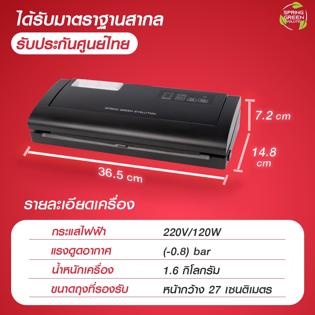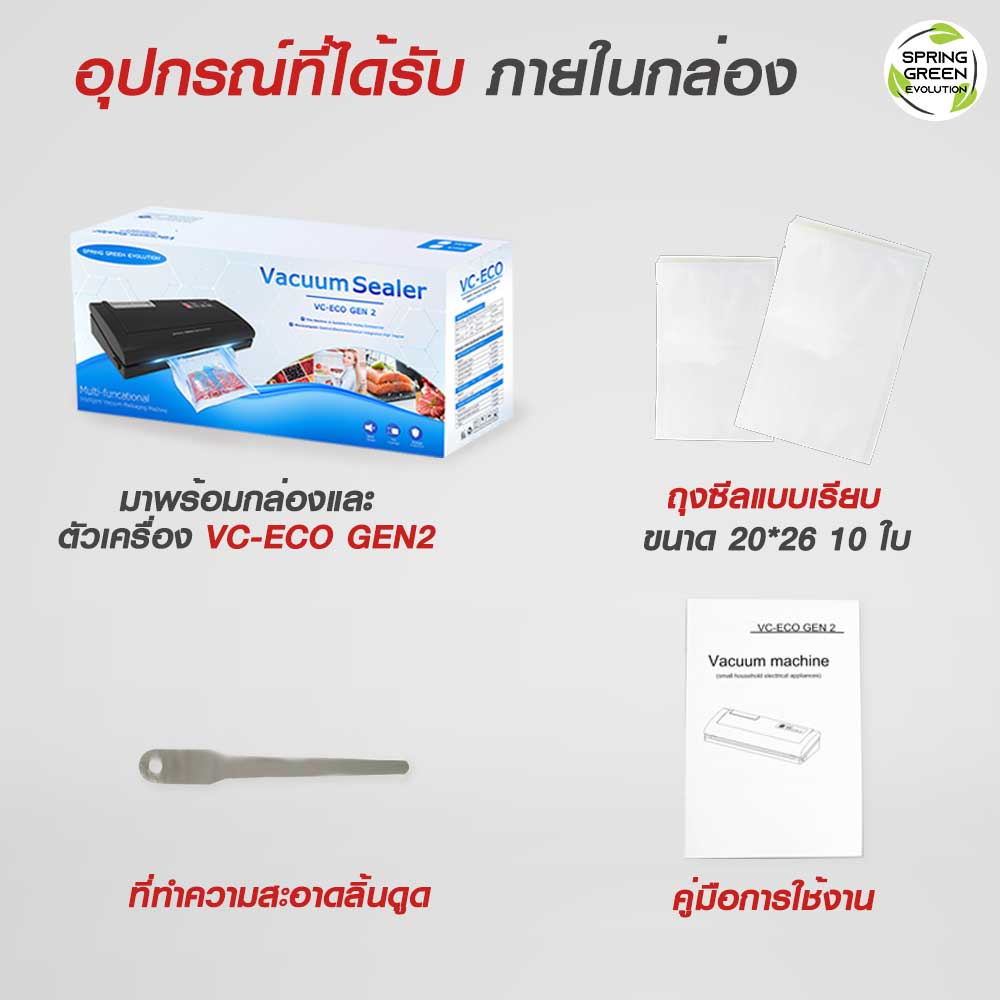 ... รุ่น VC-ECO Gen 2✨ ☆ จุดเด่นสามารถ “ซีลได้กับทุกถุง”(ยกเว้นถุงลายนูนกับถุงจีบ) ☆ กำลังการผลิตสูง 100 – 500 ใบ/วัน -------------------------------------------------------------------------------------- คุณสมบัติสินค้า ✅ ช่วยถนอมอาหารเก็บความสดได้นานขึ้น 3-5เท่า ✅ มาพร้อมแทงค์รองรับน้ำซีลได้ทั้งแห้งและเปียก ✅ จัดเป็นเครื่องซีลอเนกประสงค์ทำงานต่อเนื่องไม่มีสะดุด ✅ แถบซีลหนา 3 มิลลิเมตร ถุงไม่รั่ว ซีลละเอียดถุงสวยไม่มีตำหนิ ✅ ช่วยลดต้นทุนการผลิตได้ถึง 50% ประหยัดค่าใช้จ่าย ด้วยการใช้ถุงที่มีราคาถูกกว่า ✅ รับประกันศูนย์ไทย 1 ปี มีอะไหล่และทีมช่างให้บริการ ------------------------------------------------------------------------------ ✅ ขนาดและรายละเอียดของสินค้า ✅ พลังงานไฟฟ้า 120w กระแสไฟฟ้า 220v แรงดูดสุญญากาศ -0.7 bar ขนาดสินค้า 36.5 x 14.8 x 8.5 cm น้ำหนักสินค้า 1.6 kg ขนาดถุงที่รองรับ กว้าง 27 ซม. ความหนาแถบซีล 3 มม. รับประกัน 1 ปี ------------------------------------------------------------------------------ มาพร้อมดีไซน์ทันสมัยและทนทาน เครื่องซีลสูญญากาศกึ่งอุตสาหกรรม ทันสมัยและทนทาน สามารถซีลต่อเนื่องได้ 100 –500 ถุง/วัน ------------------------------------------------------------------------------ เครื่องซีลสูญญากาศ VC-ECOGen2 ซีลได้ทั้งแห้งและเปียก มาพร้อมแทงค์รองรับน้ำติดตั้งอยู่ด้านหลังตัวเครื่อง สามารถซีลสุญญากาศได้ทั้งวัตถุดิบแห้ง และเปียกโดยที่น้ำไม่เป็นอันตรายกับตัวเครื่อง ตอบโจทย์หลากหลายธุรกิจเพิ่มศักยภาพสำหรับการ “ซีลเปียก” สามารถใช้ได้กับวัตถุดิบที่มีความชื้นแบบหมาดๆเท่านั้น ------------------------------------------------------------------------------ แถบซีลหนา 3 มิลลิเมตร แถบซีลหนาถึง 3 มิลลิเมตร ช่วยให้การซีลถุงแน่นขึ้นในครั้งเดียว ถุงไม่แตก ไม่ซึม ไม่รั่ว เก็บไว้ได้ยาวนาน และสามารถขนส่งสินค้าที่ได้รับการซีล ผ่านไปรษณีย์ด้วยระยะทางไกลๆได้อย่างมั่นใจ ------------------------------------------------------------------------------ มั่นใจด้วยแรงดูด เครื่องซีลสูญญากาศมาพร้อมแรงดูดที่-0.8bar แรงดูดอากาศออกไปไว ประหยัดเวลา มั่นใจได้ซีลแน่น ซีลนาน อากาศไม่หลงเหลือภายในถุง ------------------------------------------------------------------------------ รองรับการใช้งานกับถุงเรียบทุกชนิด ช่วยลดต้นถุงได้ถึง 50% ถ้าเทียบกับถุงลายนูน เพราะสามารถซีลปิดปากถุงได้กับถุงเรียบได้ทุกชนิด โดยเฉพาะถุงพลาสติกราคาประหยัด ทำให้ต้นทุนสินค้าถูกลงถึง 2 เท่าเพื่อกำไรที่มากขึ้น คุ้มค่าในระยะยาว ------------------------------------------------------------------------------ ข้อควรรู้ก่อนซื้อ ซีลถุงได้ทุกชนิด(ยกเว้นถุงลายนูนและถุงจีบ) ประหยัดค่าใช้จ่ายและเป็นวิธีที่ง่ายต่อการผลิตเพิ่มมูลค่าให้กับสินค้าได้หลายเท่าไม่จำเป็นต้องใช้หลายเครื่อง เพื่อซีลถุงหลายชนิดใช้แค่เครื่องนี้รับรองเอาอยู่ ! Gallery (รูปถ่ายสินค้าจริง) เงื่อนไขการรับประกันสินค้า เพื่อประส