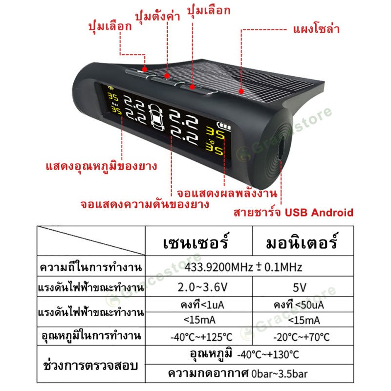 ... นน้ำ IP67,การวัดแบบเรียลไทม์ - รุ่นเก่า การชาร์จพลังงานแสงอาทิตย์ไม่จำเป็นต้องเชื่อมต่อที่จุดบุหรี่ในรถยนต์เพื่อชาร์จ (สามารถชาร์จผ่านสาย USB ได้ในวันที่ฝนตก) - ค่าที่แม่นยำ -+1-2 ค่า : ดูค่าแรงดันลมยางบนหน้าจอเดียวกัน (ปลุกและแสดงตัวเลขสีแดงเมื่อผิดปกติ) - ฟังก์ชั่นหกฟังก์ชั่น: เครื่องวัดความดันลมยาง, การตรวจสอบอุณหภูมิยาง, การตรวจสอบการรั่วไหลของอากาศ -แหล่งจ่ายไฟพลังงานแสงอาทิตย์(รุ่นเก่า), การแสดงสี่ล้อพร้อมกัน, การส่งไร้สาย
