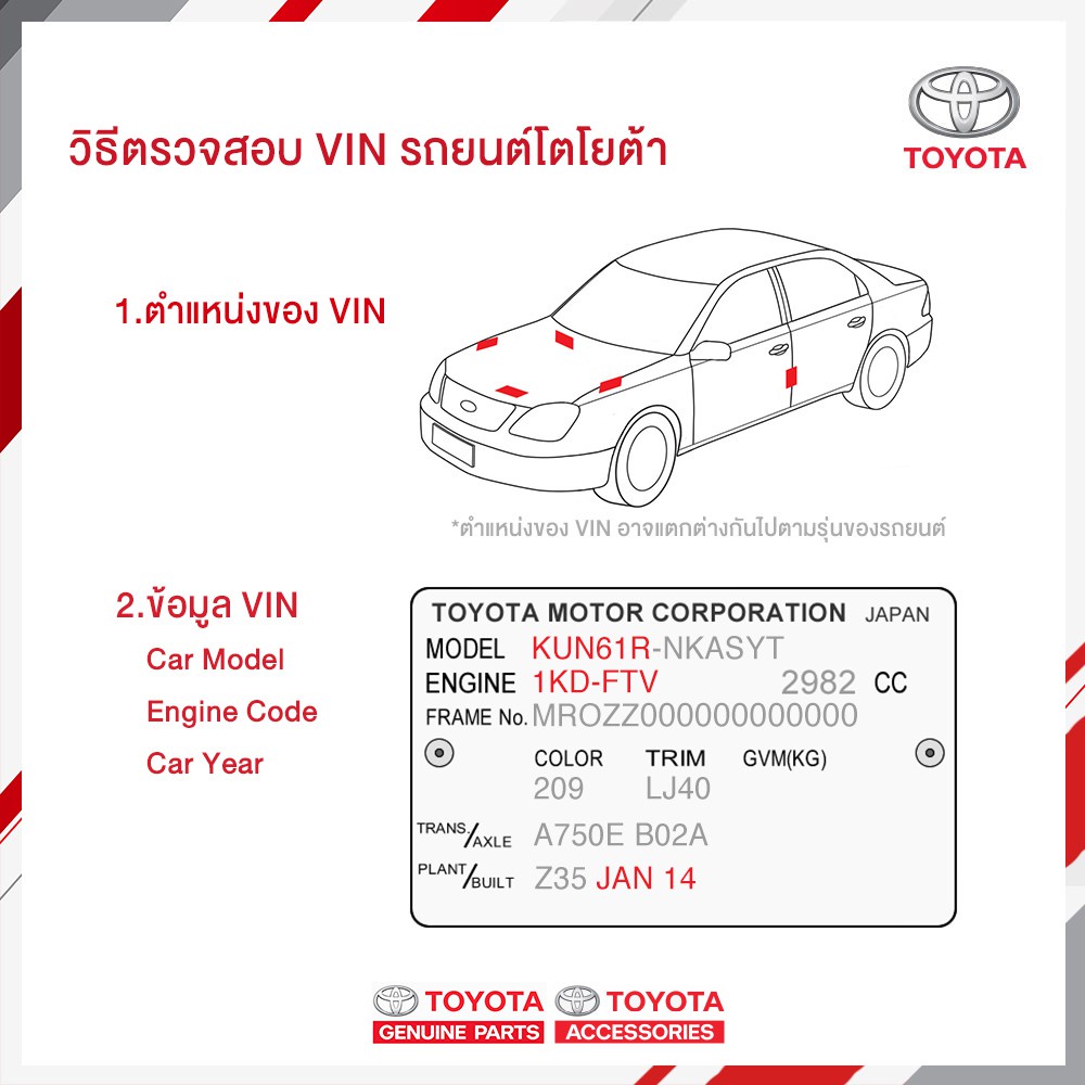 ... งหมายความว่าน้ำมันเครื่องที่ปนเปื้อนด้วยเศษผงโลหะ และคาร์บอนจะไหลเวียนอยู่ในเครื่องยนต์ เศษผงโลหะนี้ไม่เพียงแค่เร่งให้ตัวน้ำมันเครื่องเสื่อมสภาพเร็ว แต่ยังทำความเสียหายให้ส่วนประกอบของเครื่องยนต์ ทำให้เครื่องยนต์ทำงานบกพร่องและเสียหายในที่สุด นอกจากนี้การไหลเวียนของน้ำมันเครื่องที่ไม่ได้ผ่านการกรอง จะทำให้การเผาไหม้ไม่สมบูรณ์ อันเนื่องจากสิ่งเจือปนที่สะสมอยู่ในเครื่องยนต์ส่งผลให้ประสิทธิภาพการทำงานของเครื่องยนต์ลดลง และมีอัตราการสิ้นเปลืองเชื้อเพลิงสูงขึ้น ดังนั้นกรองน้ำมันเครื่องจึงต้องได้รับการเปลี่ยนตามระยะเวลาที่เหมาะสม • รักษาแรงดันน้ำมันในระบบหล่อลื่นเครื่องยนต์ที่สูง เพื่อประสิธิภาพในการหล่อลื่นเครื่องยนต์ • สามารถกรองสิ่งปนเปื้อนในน้ำมันเครื่องได้ดี ตั้งแต่เริ่มสตาร์ทเครื่องยนต์ ซึ่งป้องกันเครื่องยนต์ของคุณจากการเสียหาย • กรองน้ำมันเครื่องแท้ มีความแข็งแรง ทำให้มั่นใจได้ว่าเครื่องยนต์จะได้รับการปกป้องอย่างดี • บรรจุกรองน้ำมันเครื่องสำหรับโตโยต้า HIACE, COMMUTER, VIGO, INNOVA, FORTUNER พร้อมปะเก็นรองน็อตถ่ายน้ำมันเครื่อง 1 ชิ้น • รหัสสินค้า: 90915-YZZD2 • รุ่นที่ติดตั้งได้: HIACE (KDH200, KDH202) รหัสเครื่องยนต์: 2KD-FTV HIACE (KDH201, KDH203) รหัสเครื่องยนต์: 1KD-FTV COMMUTER (KDH223) รหัสเครื่องยนต์: 1KD-FTV (ดีเซล) COMMUTER (KDH222) รหัสเครื่องยนต์: 2KD-FTV (ดีเซล) COMMUTER (TRH223) รหัสเครื่องยนต์: 2TR-FE (เบนซิน) VIGO (TGN16,TGN26,TGN121,TGN166,TGN136) รหัสเครื่องยนต์: 2TR-FE (เบนซิน) VIGO (KUN15,KUN25,KUN35) รหัสเครื่องยนต์: 2KD-FTV (ดีเซล) VIGO (KUN16,KUN26,KUN36) รหัสเครื่องยนต์: 1KD-FTV (ดีเซล) INNOVA (TGN40) รหัสเครื่องยนต์: 1TR-FE (เบนซิน) INNOVA (KUN40) รหัสเครื่องยนต์: 2KD-FTV (ดีเซล) FORTUNER (TGN51, TGN61) รหัสเครื่องยนต์: 2TR-FE (เบนซิน) FORTUNER (KUN60) รหัสเครื่องยนต์: 2KD-FTV (ดีเซล) FORTUNER (KUN51,KUN61) รหัสเครื่องยนต์: 1KD-FTV (ดีเซล) • ระยะการเปลี่ยน: ทุกๆ 10,000 กม.หรือ 6 เดือน • ระยะเวลาการรับประกัน: ภายใน 3 เดือน • ระยะเวลาในการจัดส่งสินค้า: 2-5 วันทำการ เงื่อนไขการรับประกันสินค้า TOYOTA Official Store รับประกันสินค้าเป็นระยะเวลา 3 เดือน นับจากวันที่ซื้อสินค้า โดยอ้างอิงจากวันที่ออก “ใบส่งของ/ สำเนาใบกำกับภาษี” ภายใต้เงื่อนไข ดังนี้ 1. การดัดแปลงสภาพหรือแก้ไขใด ๆ จากศูนย์บริการอื่นที่ไม่ใช่ศูนย์บริการมาตรฐานโตโยต้า 2. อุบัติเหตุจากการใช้งาน และการใช้งานผิดประเภท 3. ผลกระทบเนื่องจากการบำรุงรักษาทำความสะอาดไม่ถูกต้อง และจัดเก็บในสถานที่ที่ไม่เหมาะสม 4. สินค้าเสียหายจากการใช้งานที่ไม่ถูกต้อง เช่นการติตตั้งผิดพลาด การตกกระแทกแตกหักเสียหาย เป็นต้น ขั้นตอนการรับประกันสินค้า 1. การส่งคืนสินค้า/ เคลมสินค้าทุกครั้ง ต้องแนบหลักฐาน ได้แก่ “ใบส่งของ/ ส
