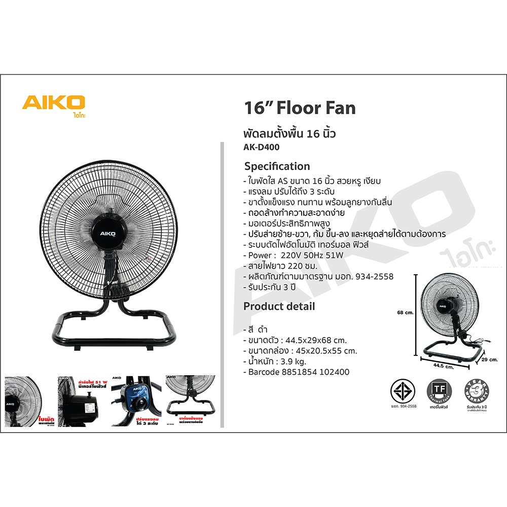 AIKO #AK-D400 พัดลมใบพัดพลาสติก 16" ส่ายได้ (สั่งได้ออเดอร์ละ1ตัว) *รับประกันมอเตอร์ 3 ปี