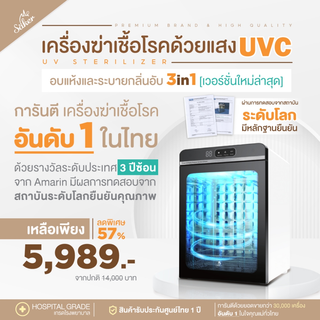 ... ฆ่าเชื้อโรคอันดับ1ในประเทศไทยจากAmarin3ปีซ้อน 🌟Säkerเครื่องฆ่าเชื้อโรคทุกชนิดด้วยแสงUVC3in1 ✅อบแห้ง✅กำจัดกลิ่นอับ✅กลิ่นไม่พึงประสงค์ได้ ✅ฆ่าเชื้อโรคด้วยแสง UVC ปลอดภัย มั่นใจ ไม่มีสารตกค้าง #โรงพยาบาลชั้นนำหลายแห่งซื้อสินค้าแบรนด์Säkerไปใช้จริงค่ะ ✅การันตีรางวัลเครื่องฆ่าเชื้อโรคอันดับ1ในประเทศไทยจาก Amarin Baby & Kids Awards3ปีซ้อน ✅ฆ่าเชื้อไวรัส และ แบคทีเรีย ได้ 99.999% ใช้ฆ่าเชื้อโรคได้มากมาย ใช้กับอุปกรณ์ได้เอนกประสงค์มาก เช่น ขวดนม,อุปกรณ์อาหาร,อุปกรณ์เครื่องปั๊มนม,ของเล่น,แปรงแต่งหน้า, อาหาร น้ำ ชา,กาแฟ อื่นๆ เครื่องเดียวใช้ได้หลายอย่างค่ะ ✅ผ่านการทดสอบคุณภาพจากสำนักงานพัฒนาวิทยาศาสตร์และเทคโนโลยีแห่งชาติ (สวทช.) ประเทศไทย ว่าฆ่าเชื้อโรคได้จริง ✅ถูกกว่าเกรดเดียวกัน2-3เท่า เกรดของSäkerเทียบเท่ากับรุ่นที่ขาย 1x,xxx฿+ ✅ใช้วัสดุพรีเมี่ยม และ หลอดUVCเกรดที่ดีที่สุดในโลก มีหลักฐานยืนยัน ✅อบแห้งด้วยความร้อนต่ำ อ่อนโยนกว่า ช่วยยืดอายุอุปกรณ์ให้นานยิ่งขึ้น ✅เสียงอบแห้ง เงียบมาก ยืนยันเครื่องทำงานเงียบที่สุดในโลก ✅ดารา เซเลป นักข่าว คนมีชื่อเสียงระดับประเทศเลือกใช้จริง ✅เทคโนโลยี Airflow-S/D ช่วยลดกลิ่นอับในสิ่งของ ช่วยลดกลิ่นบูด กลิ่นเหม็นเปรี้ยว กลิ่นต่างๆในขวดนมได้ดีเยี่ยม ✅มั่นใจ100%นี่คือเครื่องฆ่าเชื้อโรค อบแห้ง ระบายกลิ่นอับที่ดีที่สุดในไทย การันตีรางวัลระดับประเทศ และ มีใบเซอร์ติฟิเคทหลายใบค่ะ ✅วัสดุที่ใช้ปลอดสารก่อมะเร็ง (BPA FREE) ✅วัสดุที่ใช้ไม่มีสารพิษ (NON-TOXIC) ✅ภายในเครื่องที่สัมผัสสิ่งของ ใช้วัสดุแบบฟู้ดเกรด เกรดสัมผัสอาหารได้ ✅ภายในเครื่องใช้สแตนเลส เกรดอาหาร คุณภาพสูงมาก ✅ภายในแบบไดมอนด์ สะท้อนแสงได้ทั้งตู้ ฆ่าเชื้อโรคได้ทุกจุด ไม่มีมุมอับ ลิขสิทธิ์1เดียวเฉพาะแบรนด์ Säker (ให้ผลการทดสอบการฆ่าเชื้อโรคเป็นเครื่องยืนยัน) ✅มั่นใจกว่าด้วยหลอด UV-C ที่ดีที่สุด ยี่ห้อ Philips ของแท้ ฆ่าเชื้อโรคได้ 99.999% หลอด UV-C ยี่ห้อ Philips เป็นที่ยอมรับในระดับสากลว่าได้ผลจริง คุณภาพสูงจริงค่ะ เป็นหลอดฆ่าเชื้อโรคที่ดีที่สุด วัสดุทุกชิ้นใช้เกรดดีที่สุด ตัวท็อปที่สุดค่ะ ย้ำเราคือเจ้าเดียวในไทยที่ใช้หลอด UVC Philips ตัวท็อปและดีที่สุดค่ะ ✅บริการหลังการขายอันดับ1ในประเทศไทย ศูนย์บริการเปิดตลอด365วัน/ปี ไม่มีวันหยุด ✅สินค้ารับประกันศูนย์ไทย1ปี พร้อมดูแลหลังการขายตลอดอายุการใช้งาน 👉สรุป✅ฆ่าเชื้อโรคด้วยแสงUVCจากหลอดPhilips ตัวท็อป รุ่นที่ดีที่สุด ประสิทธิภาพสูงสุด การันตีแสงUVCไม่จะอ่อนค่าลงตลอดอายุการใช้งาน เทคโนโลยีอบแห้ง รุ่นใหม่ล่าสุด Airflow-S/D 360องศา ลมร้อนแบบอ่อนโยนใช้