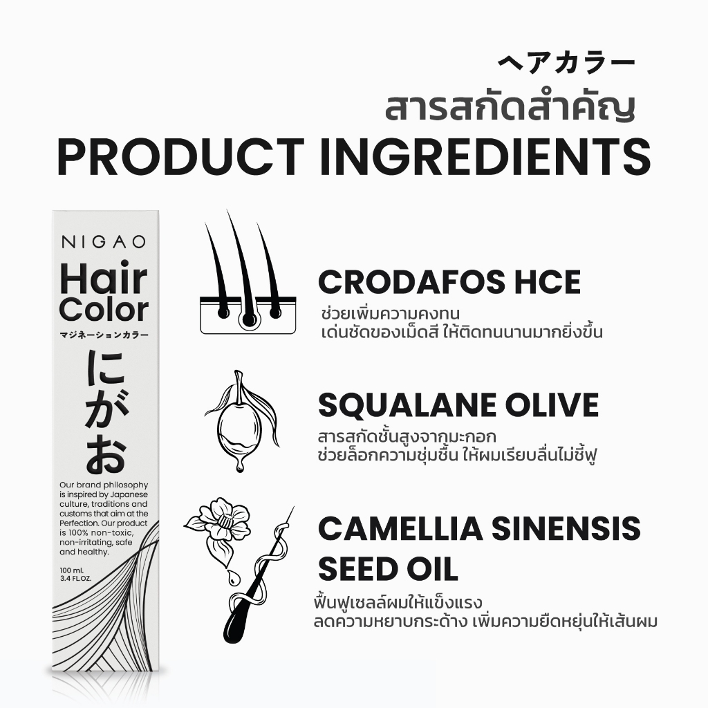 Description : ครีมเปลี่ยนสีผมไม่มีแอมโมเนีย ไม่มีกลิ่นฉุน และไม่ระคายเคืองหนังศีรษะ ให้สีผมสวยสุขภาพดี และเฉดสีอิ่มชัด วิธีใช้ผลิตภัณฑ์ : ผสม ครีมเปลี่ยนสีผม นิกาโอะ แฮร์ คัลเลอร์ กับ ดีเวลลอปเปอร์ ในภาชนะที่ไม่ใช่โลหะ (อัตราส่วนผสม 1:1.5) คนให้เข้ากัน ป้ายครีมให้ทั่วเส้นผมโดยเว้นห่างจากโคนผม 1