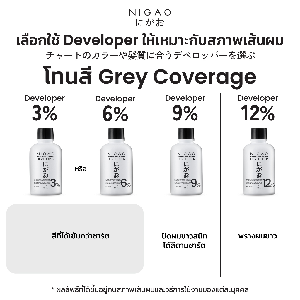 ... นิ้ว ทิ้งเวลาไว้ 45 นาที และป้ายครีมที่บริเวณโคนผมทิ้งไว้ 15 นาที แล้วล้างออกให้สะอาด ปริมาณการใช้ : - คนผมสั้นประบ่า ใช้ 1 หลอด - คนผมยาวไม่เกินกลางหลัง ใช้ 2 หลอด - คนผมยาวเกินกลางหลัง ใช้ 3 หลอด *หากเป็นคนผมหนาควรเพิ่มปริมาณอีก 1 หลอด ข้อแนะนำเพื่อความปลอดภัย : - เลือก % ของ Developer ให้เหมาะสมกับสภาพเส้นผม เพื่อป้องกันเส้นผมเสียหาย - สามารถปรึกษาสภาพเส้นผมและวิธีการใช้ผลิตภัณฑ์กับแอดมินได้เลย - ทดสอบการแพ้อย่างเคร่งครัด 48 ชม. ก่อนใช้ผลิตภัณฑ์นี้ (ดูวิธีทดสอบในกล่อง) หมายเหตุ : *ผลลัพธ์ที่ได้ขึ้นอยู่กับสภาพเส้นผมของแต่ละบุคคล *หน้าจอของแต่ละอุปกรณ์การสื่อสารมีผลต่อสีที่อาจจะผิดเพี้ยนไปจากชาร์ตสีจริง