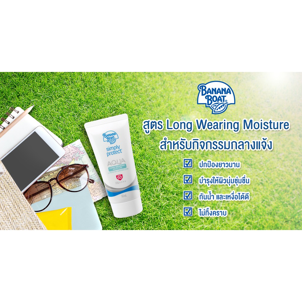 สินค้าหมดอายุ : 10 / 2026 (สำหรับผิวหน้า ทำกิจกรรมกลางแจ้ง) Banana Boat Simply Protect Aqua Long Wearing UV Protection Sunscreen Lotion SPF50+ PA++++ (50 ml.) --- สูตรสำหรับกิจกรรมกลางเเจ้ง ปกป้องยาวนาน เเละ กันน้ำ กันเหงื่อดีเยี่ยม --- กันแดดเนื้อบางเบาสูตรอควา นวัตกรรมใหม่จากญี่ปุ่น เกลี่