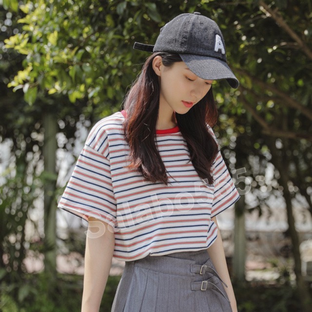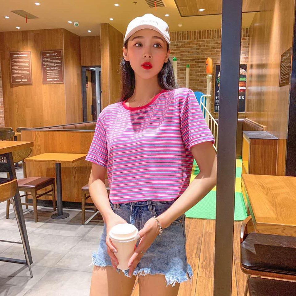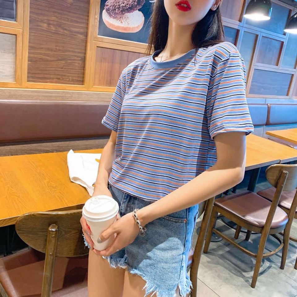 SALABO(พร้อมส่ง) เสื้อยืดคอกลมแขนสั้นพิมพ์ลายทางลำลอง สไตล์: วินเทจ สำหรับผู้หญิง เรียบๆแต่สวยใส่ชิวๆ #9304