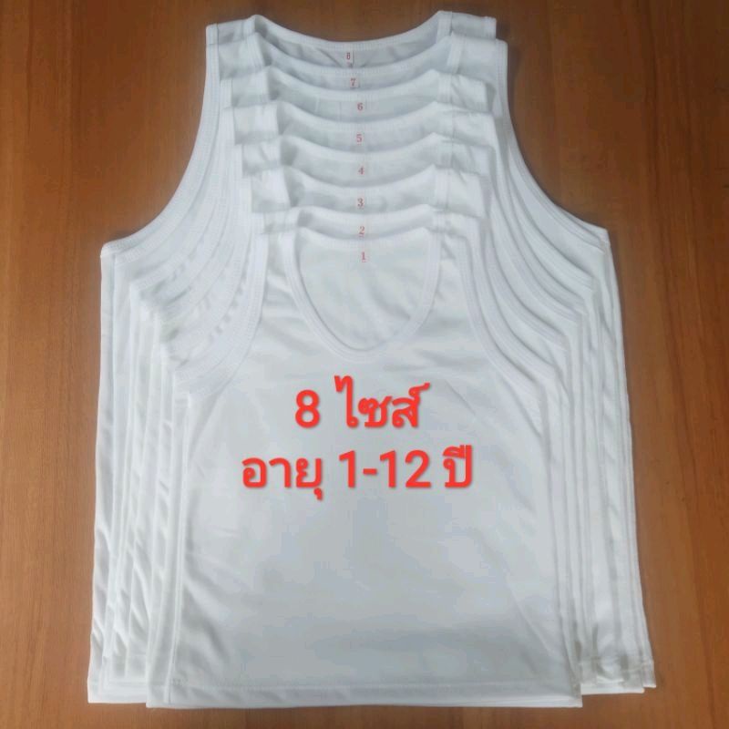 ... บางช่วงเสื้อกล้ามที่ขายอาจจะหมดชั่วคราวนะคะ ***ขอย้ำว่าผ้าบางนะคะจะได้ไม่ต่อว่ากัน*** ***กรุณาอ่านก่อนสั่งซื้อ สินค้าล็อตใหม่เนื้อผ้าแบบใหม่นะคะเป็นเนื้อผ้าราคาประหยัดซึ่งเป็นแนวทางของทางร้านที่เน้นสินค้าราคาถูกและคุณภาพการตัดเย็บที่ดีและใช้งานได้จริง มีความคุ้มค่าคุ้มราคาค่ะ เพื่อเป็นทางเลือกให้กับลูกค้าที่ต้องการความประหยัดค่ะ **เนื้อผ้าทำมาจากเส้นใยสังเคราะห์ คุณสมบัติไม่หด ไม่ย้วย สีขาวสว่างค่ะ เนื้อผ้ามีความทนทานค่ะใส่ได้นานปี มีขนาดตั้งแต่เด็กอายุ 1-14 ปี ใส่ได้ทั้งเด็กชายและเด็กหญิง ***ลูกค้าควรเลือกขนาดไซส์จากการวัดตัวเด็กเป็นหลักค่ะ 🎽🎽ขนาดรอบอกและความยาวโดยประมาณ🎽🎽 size 1 รอบอก 22"ยาว 14" อายุ 1-2 ปีน้ำหนักไม่เกิน 10 กก. size 2 รอบอก 24"ยาว 15" อายุ 2-3 ปีน้ำหนัก 14 กก. size 3 รอบอก 25.5"ยาว16"อายุ 3-4 ปีน้ำหนัก 17 กก size 4 รอบอก 27"ยาว17"อายุ 4-5 ปีน้ำหนัก 20 กก. size 5 รอบอก 28.5"ยาว18"อายุ 5-6 ปีน้ำหนัก 25 กก size 6 รอบอก 30"ยาว19"อายุ 6-8 ปีน้ำหนัก 30 กก size 7 รอบอก 31.5"ยาว21"อายุ9-11ปีน้ำหนัก 35กก size 8 รอบอก 33"ยาว22"อายุ12-14 ปีน้ำหนัก 40กก **เป็นค่าโดยประมาณโปรดเลือกไซส์จากการวัดรอบอกเป็นหลักนะคะ 🙏🙏ขอบพระคุณลูกค้าทุกท่านที่อุดหนุนค่ะ🙏🙏