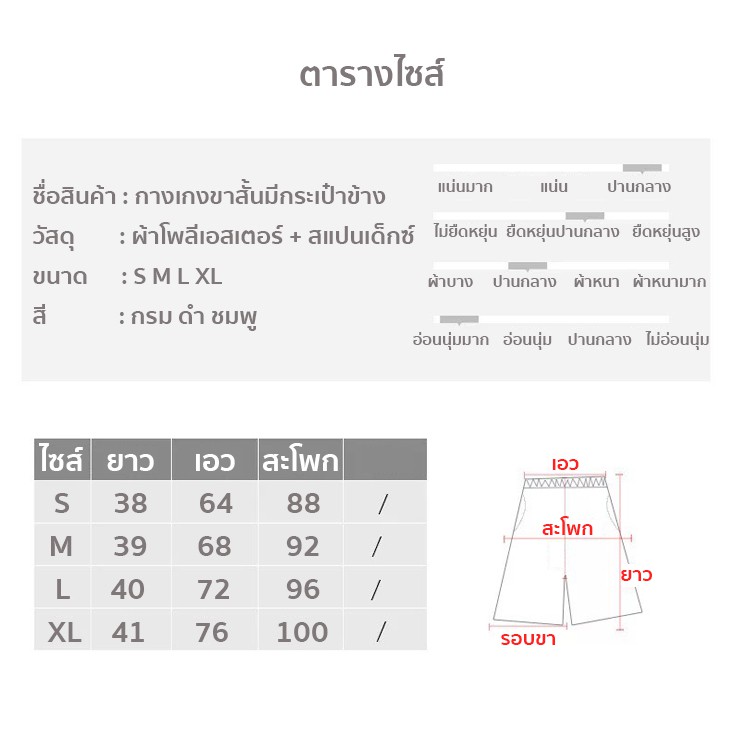 ... ส่ไปวิ่ง ฟิตเนส โยคะ ได้หมดจ้า กางเกงขาสั้น ใส่อยู่บ้าน หรือใส่เล่น ใส่วิ่ง ออกกำลังกาย และกิจกรรมอื่น ผ้าไม่บางเนื้อผ้าหนา ตัวนี้มีซับใน มีกระเป๋าข้างใส่โทรศัพท์ขนาดหน้าจอได้ถึง 8นิ้ว เหมาะสมกับทุกไลฟ์สไตล์ เนื้อผ้า Polyester สีสวยมาก มี 3 สีให้เลือก เทา ดำ ชมพู (สีอาจคลาดเคลื่อนจากรูปภาพเนื่องจากแสง) รายละเอียด SIZE โดยประมาณ M เอว 68cm สะโพก 92cm ยาว 39Cm L เอว 72cm สะโพก 96cm ยาว 40cm XL เอว 76cm สะโพก 100cm ยาว 41Cm