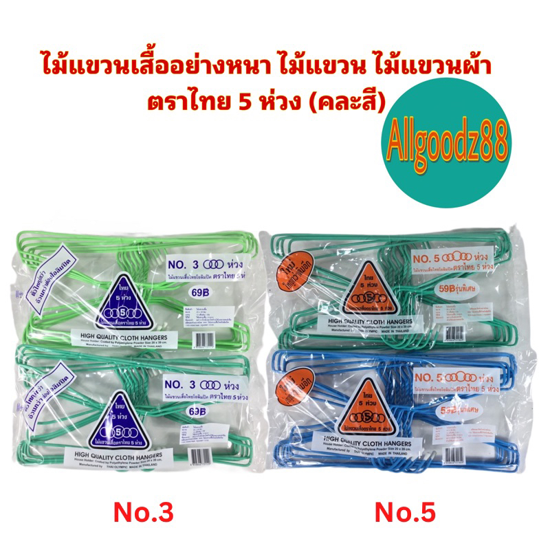 ไม้แขวนเสื้อ ตราไทย 5 ห่วง 1 แพ็ค No. 3 ห่วง (แบบหนา) -ขนาด 20x39 ซม. -12 อันต่อ 1 ห่อ -ห่อละ 1 สี -ราคาต่อ 1 ห่อ No. 5 ห่วง (แบบธรรมดา) -ขนาด 20x39 ซม. -12 อันต่อ 1 ห่อ -ห่อละ 1 สี -ราคาต่อ 1 ห่อ สินค้าในรูป ถ่ายจากสินค้าขนาดจริง หากมีข้อสงสัย/สอบถาม ทักแชท Allgoodz88 ขอข