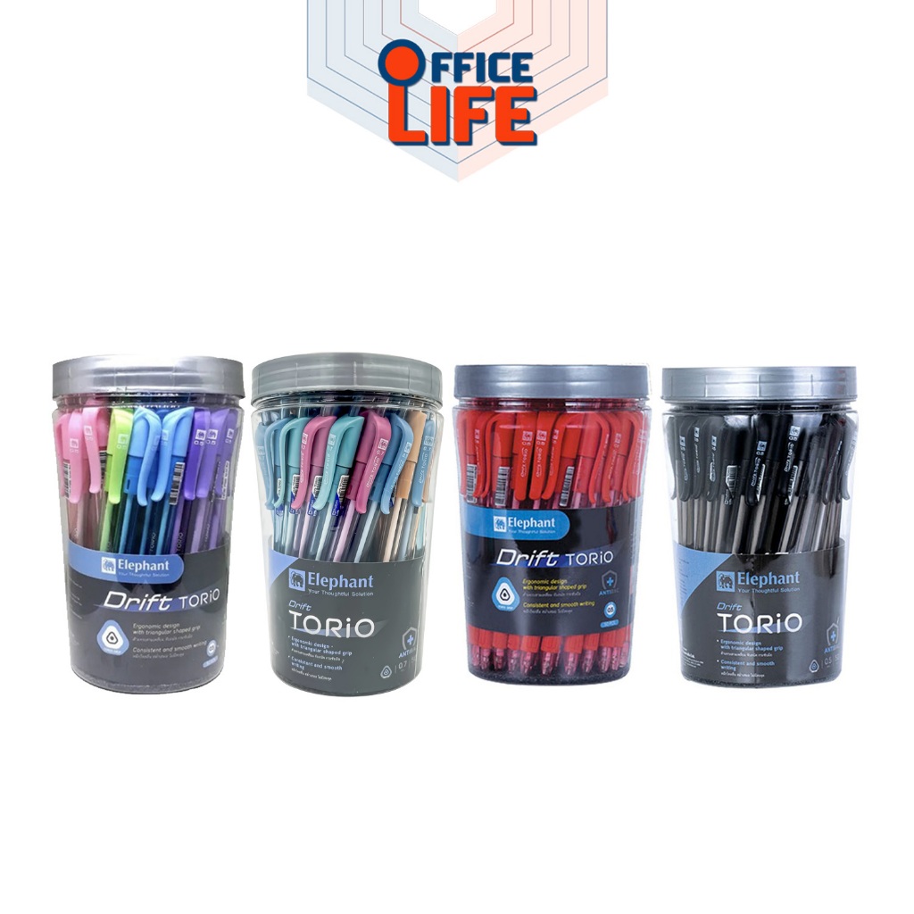 Elephant ปากกาลูกลื่น ปากกา รุ่น Drift Torio ตราช้าง ปากกาดริฟท์ โทริโอะ (Drift Torio) 0.5มม. หมึกสีน้ำเงิน (50 ด้าม) ด้ามคละสี หัวปากกาผลิตจากนิเกิล-ซิลเวอร์ แข็งแรงทนทาน ควบคุมการไหลของน้ำหมึกได้ดี หมึกเข้ม เส้นคมชัด ไม่เยิ้ม ดีไซน์ตัวด้ามโปร่งสีสันสดใส ปุ่มกดและคลิปสีเดียวกับด้าม - ปากกาลู