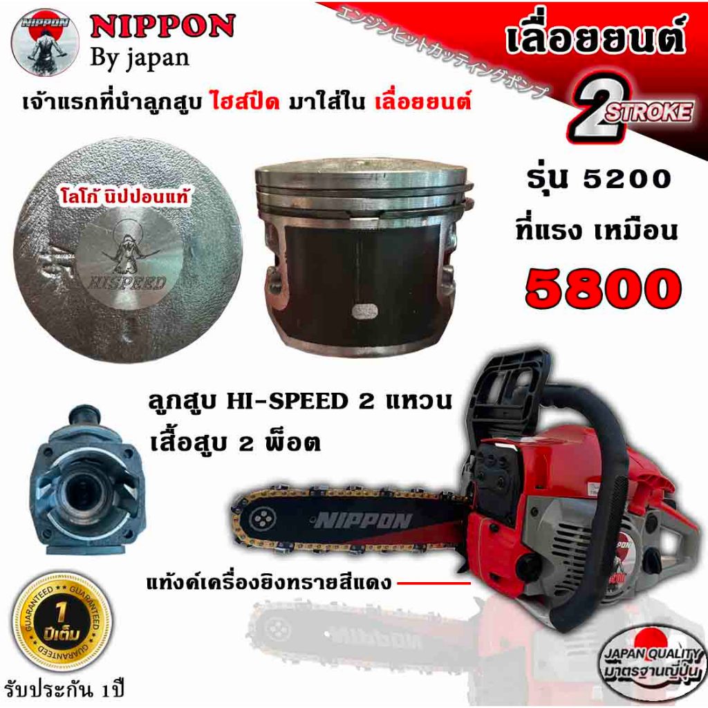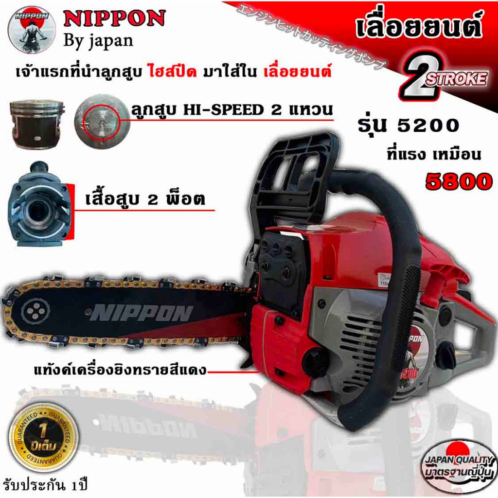 เครื่องเลื่อยนต์ เลื่อยยนต์ เลื่อยโซ่ยนต์ NIPPON 5200D 6HPลูกสูบไฮสปีด/เสื้อ2พ็อต/ท่อ3รู/บาร์ดำแดงโซ่ทอง รับประกัน 1 ปี