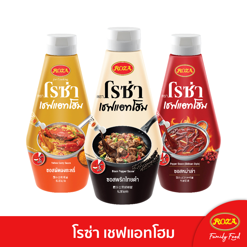 โรซ่าเชฟแอทโฮม Roza Chef@Home ซอสปรุงสำเร็จ 3 รสชาติ ผัดผงกะหรี่/ หม่าล่า/ พริกไทยดำ ขนาด 320-330 กรัม อร่อยง่ายใน 5 นาที