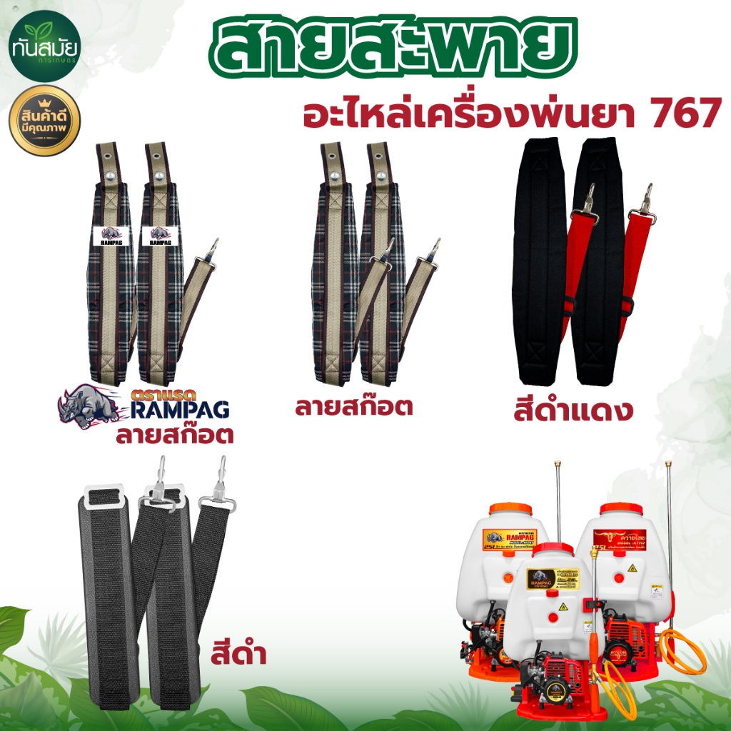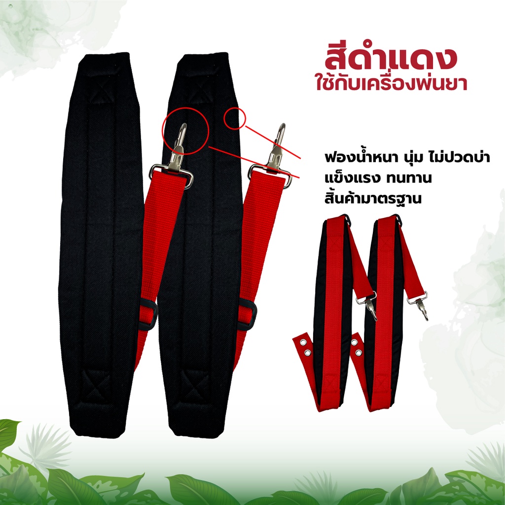 รายละเอียด ชื่อสินค้า : สายสะพายเครื่องพ่นยา รุ่น : 767 (สายคู่) ประเภท : อุปกรณ์เสริม ใช้ได้กับ : เครื่องพ่นยา เครื่องพ่นปุ๋ย บรรจุ : 1 คู่ คุณสมบัติ : 1.นุ่ม แข็งแรง สวยงาม พร้อมน็อตยึดครบชุดใช้ได้เลย 2.ทรงหนาพิเศษใส่สะบาย ลดอากาศปวด 3.ใส่กับเครื่องพ่นยา767 เครื่องพ่นปุ๋ย ใส่ได้ทุกยี